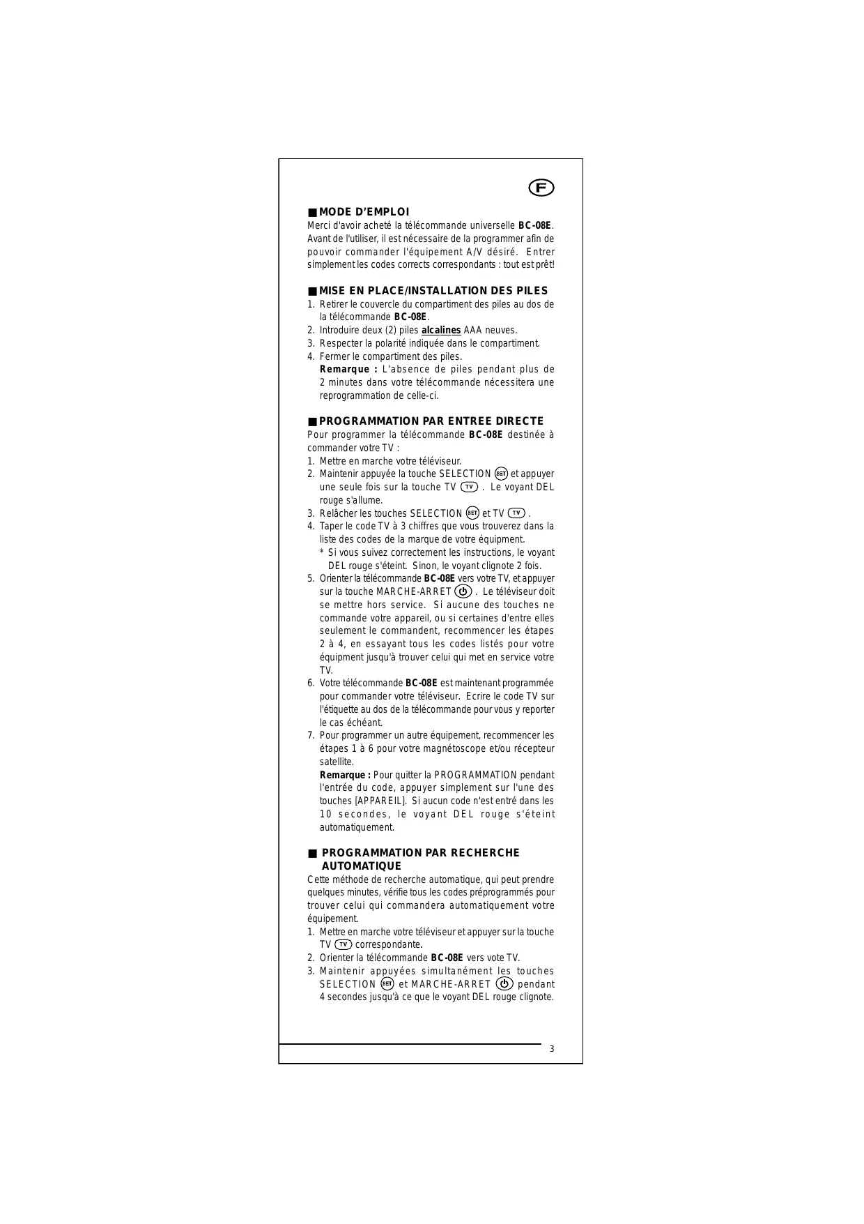 jusqu'à ce que le téléviseur se mette hors service. Lorsque le téléviseur est hors service, la télécommande BC-08E est réglée pour commander votre appareil. CONSEIL : Pendant le mode de Recherche Manuelle, vous pouvez utiliser la touche SELECTION en touche de basculement avant/arrière pour localiser rapidement le code correct de votre TV.