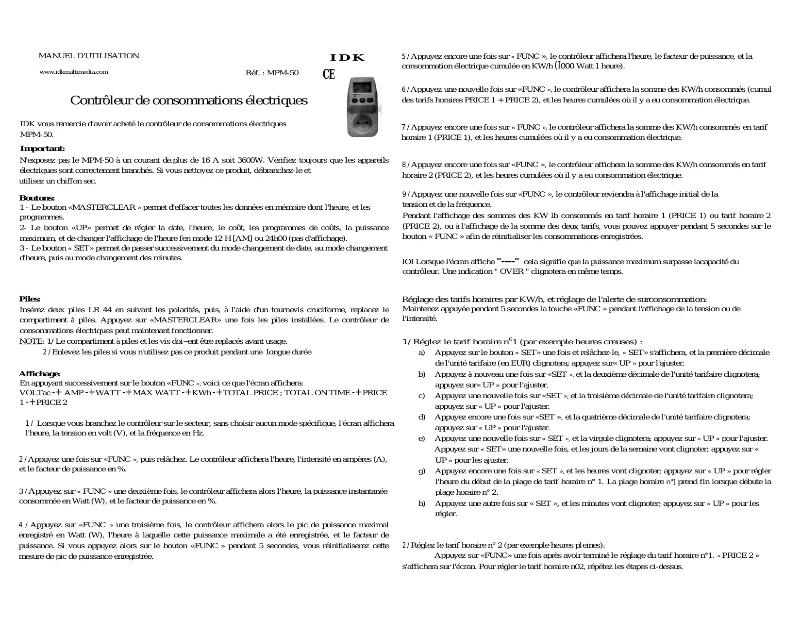 MPM-50 - Contrôleur de consommation électrique IDK MULTIMEDIA - Notice d'utilisation et mode d'emploi gratuit