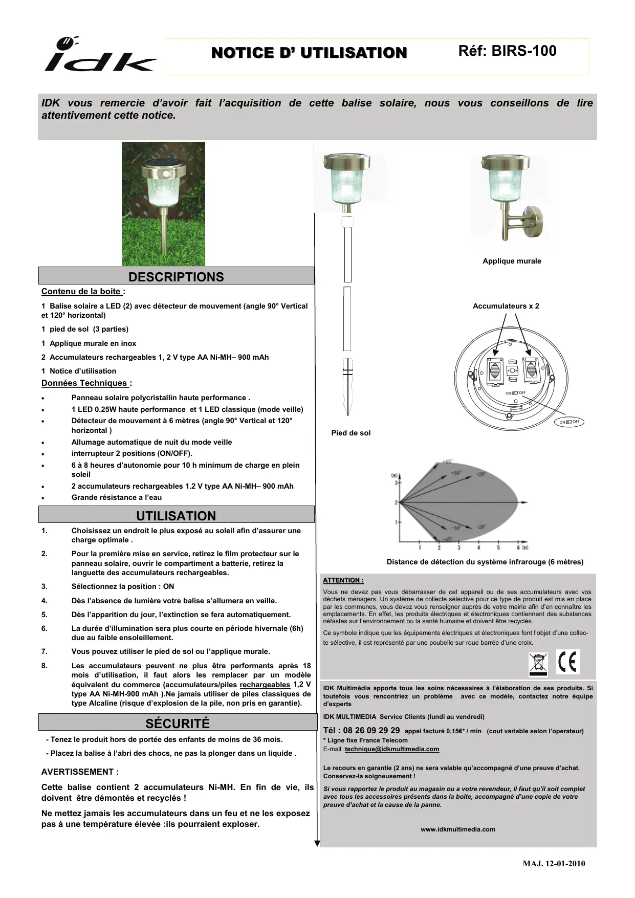Téléchargez la notice de votre Éclairage extérieur solaire au format PDF gratuitement ! Retrouvez votre notice BIRS-100 - IDK MULTIMEDIA et reprennez votre appareil électronique en main. Sur cette page sont publiés tous les documents nécessaires à l'utilisation de votre appareil BIRS-100 de la marque IDK MULTIMEDIA.