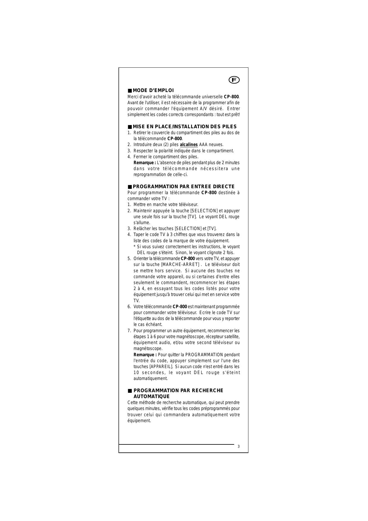 Merci d'avoir acheté la télécommande universelle CP-800. Avant de l'utiliser, il est nécessaire de la programmer afin de pouvoir commander l'équipement A/V désiré. Entrer simplement les codes corrects correspondants : tout est prêt!