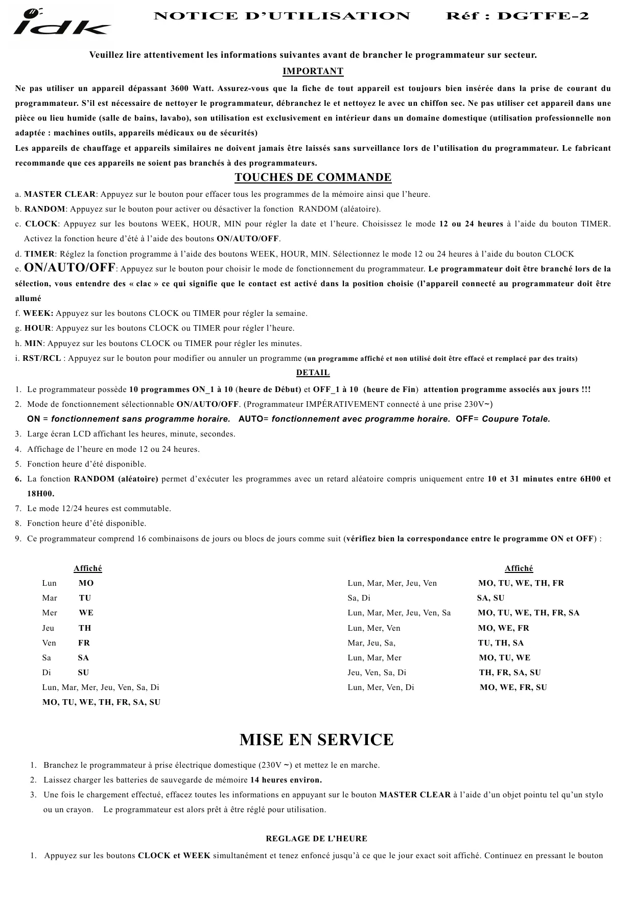 DGTFE-2 - Programmateur électrique IDK MULTIMEDIA - Notice d'utilisation et mode d'emploi gratuit