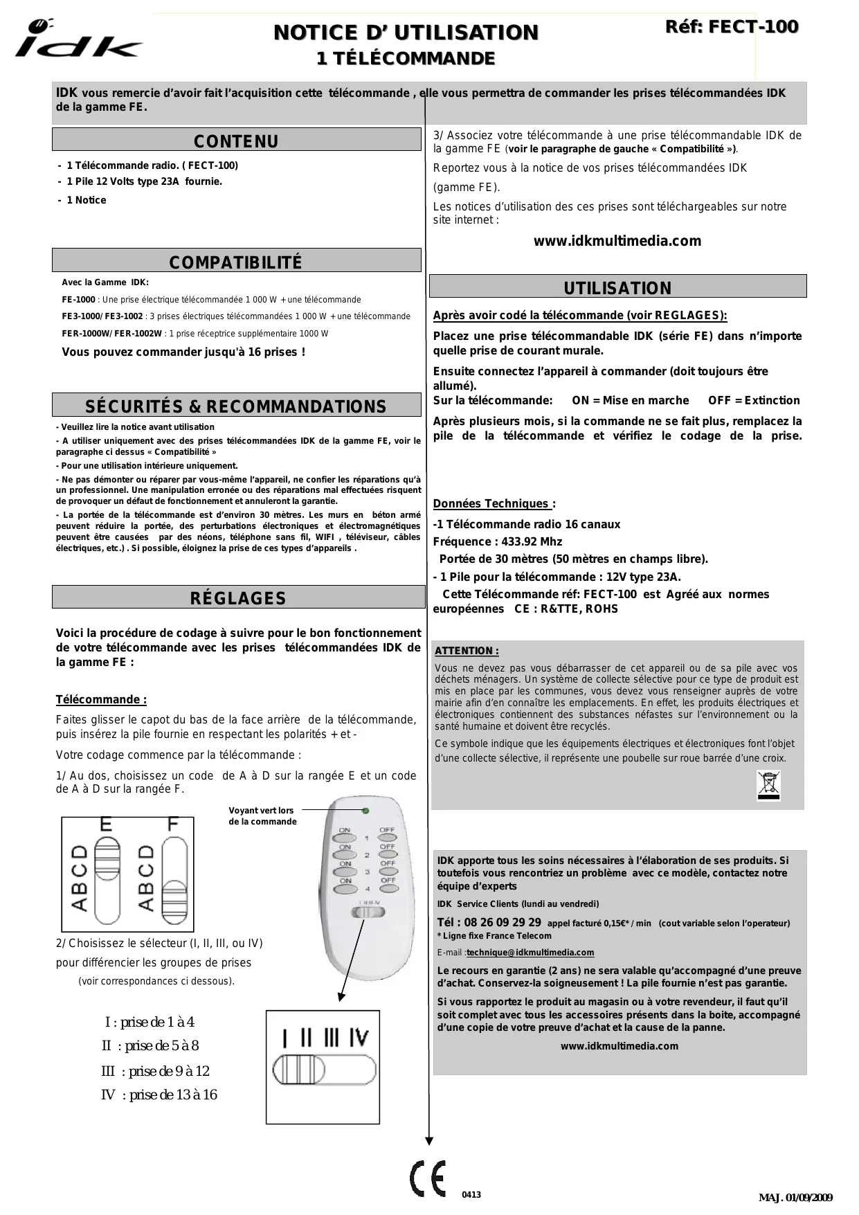 - Veuillez lire la notice avant utilisation - A utiliser uniquement avec des prises télécommandées IDK de la gamme FE, voir le paragraphe ci dessus « Compatibilité » Ensuite connectez l’appareil à commander (doit toujours être allumé). Sur la télécommande: ON = Mise en marche OFF = Extinction Après plusieurs mois, si la commande ne se fait plus, remplacez la pile de la télécommande et vérifiez le codage de la prise. - Pour une utilisation intérieure uniquement. - Ne pas démonter ou réparer par vous-même l’appareil, ne confier les réparations qu’à un professionnel. Une manipulation erronée ou des réparations mal effectuées risquent de provoquer un défaut de fonctionnement et annuleront la garantie. - La portée de la télécommande est d’environ 30 mètres. Les murs en béton armé peuvent réduire la portée, des perturbations électroniques et électromagnétiques peuvent être causées par des néons, téléphone sans fil, WIFI , téléviseur, câbles électriques, etc.) . Si possible, éloignez la prise de ces types d’appareils . Données Techniques : -1 Télécommande radio 16 canaux Fréquence : 433.92 Mhz Portée de 30 mètres (50 mètres en champs libre). - 1 Pile pour la télécommande : 12V type 23A. RÉGLAGES Voici la procédure de codage à suivre pour le bon fonctionnement de votre télécommande avec les prises télécommandées IDK de la gamme FE : Télécommande : Faites glisser le capot du bas de la face arrière de la télécommande, puis insérez la pile fournie en respectant les polarités + et Votre codage commence par la télécommande : Cette Télécommande réf: FECT-100 est Agréé aux normes européennes CE : R&TTE, ROHS ATTENTION : Vous ne devez pas vous débarrasser de cet appareil ou de sa pile avec vos déchets ménagers. Un système de collecte sélective pour ce type de produit est mis en place par les communes, vous devez vous renseigner auprès de votre mairie afin d’en connaître les emplacements. En effet, les produits électriques et électroniques contiennent des substances néfastes sur l’environnement ou la santé humaine et doivent être recyclés. Ce symbole indique que les équipements électriques et électroniques font l’objet d’une collecte sélective, il représente une poubelle sur roue barrée d’une croix. 1/ Au dos, choisissez un code de A à D sur la rangée E et un code de A à D sur la rangée F. Voyant vert lors de la commande IDK apporte tous les soins nécessaires à l’élaboration de ses produits. Si toutefois vous rencontriez un problème avec ce modèle, contactez notre équipe d’experts IDK Service Clients (lundi au vendredi) Tél : 08 26 09 29 29 2/ Choisissez le sélecteur (I, II, III, ou IV) pour différencier les groupes de prises (voir correspondances ci dessous). appel facturé 0,15€* / min (cout variable selon l’operateur)