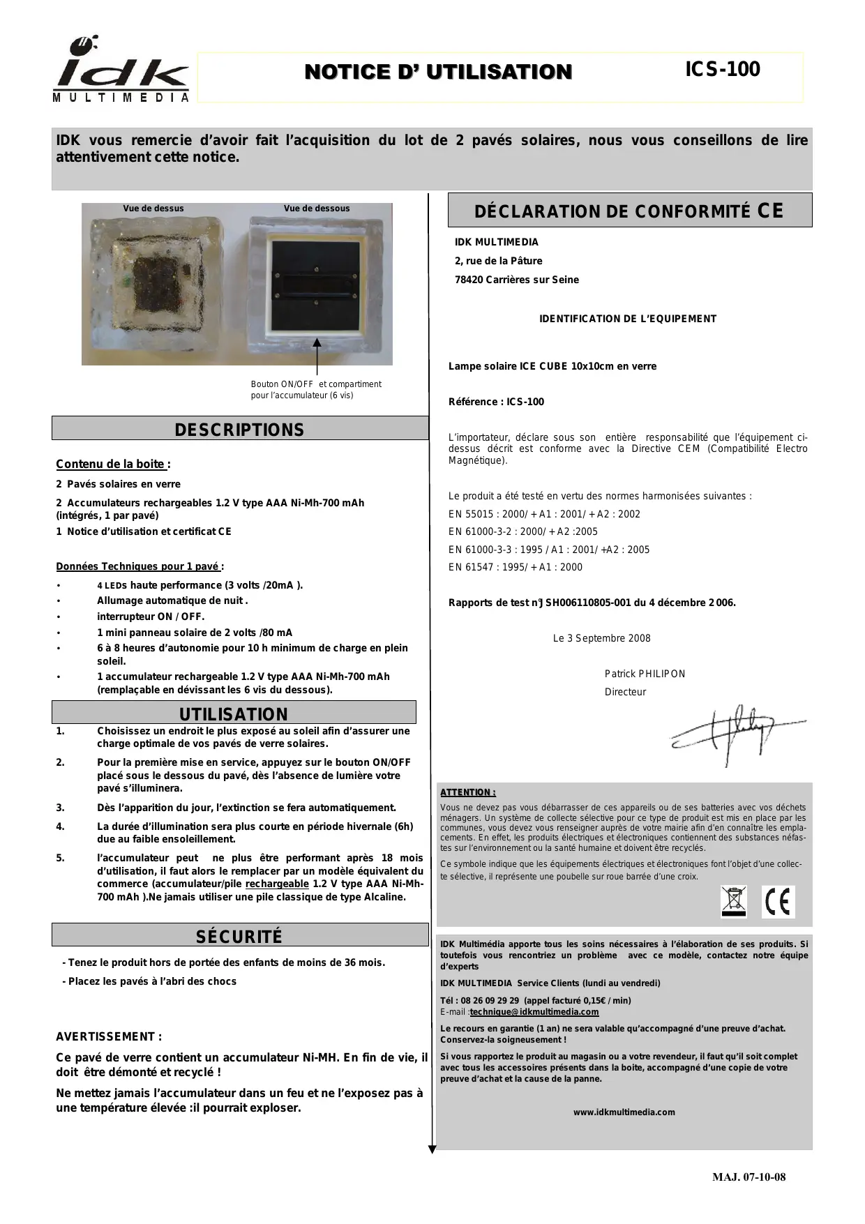 IDK you remercie d'avoir fait l'acquisition du lot de 2 pavés solaires, nous vous conseillons de dire attentivement cette notice.