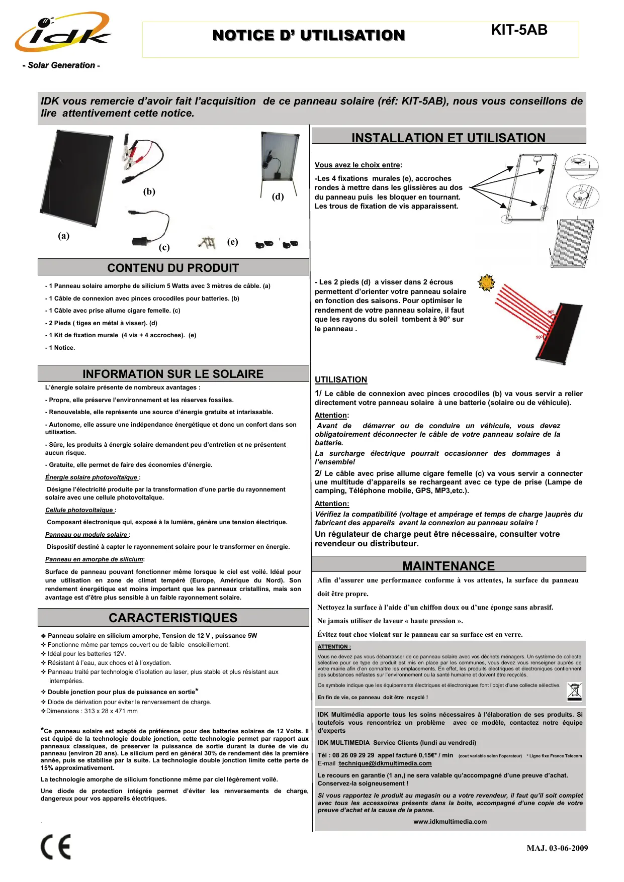IDK vous remercie d'avoir fait l'acquisition de ce panneau solaire (réf: KIT-5AB), nous vous conseillons de lire attentivement cette notice.
