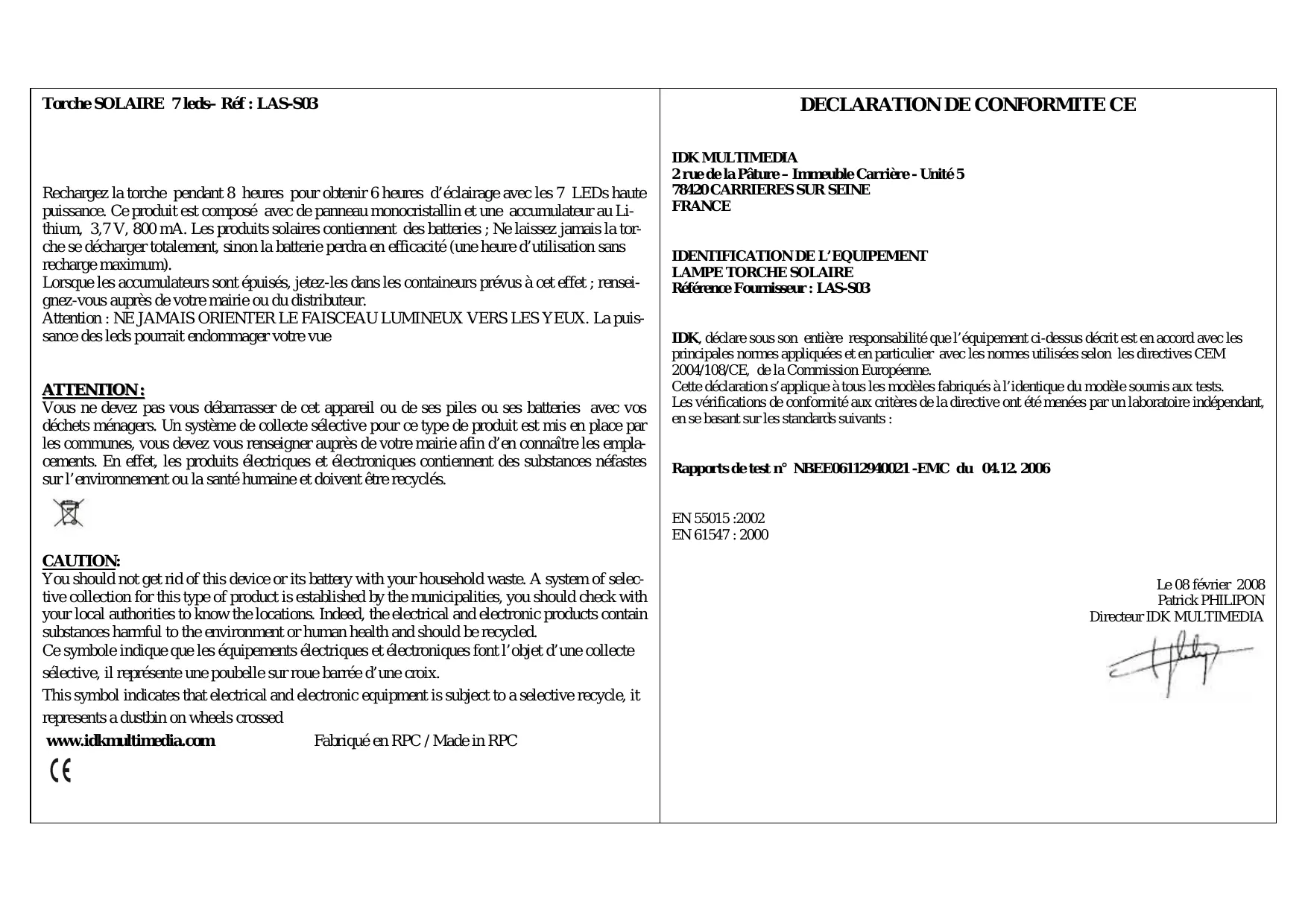 | Torche SOLAIRE 7 leds– Réf : LAS-S03 | DECLARATION DE CONFORMITE CE |