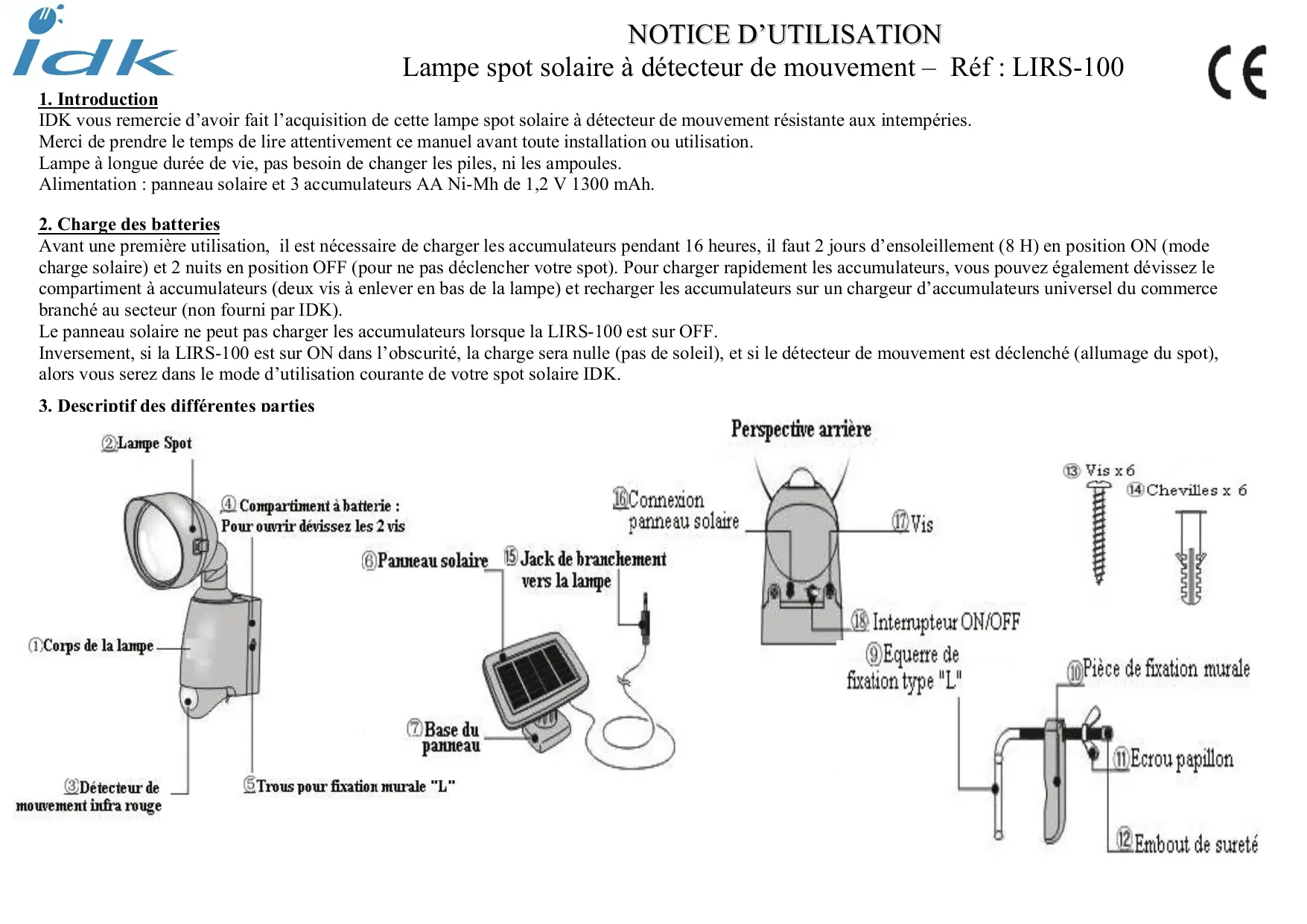 IDK you re mercie d'avoir fait l'acquisition de cette lampe spot solaire a detecteur de mouvement resistante aux intemperies. Merci de prendre le temps de dire attentivement ce manuel avant toute installation ou utilisation.