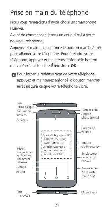 Prise en main du téléphone Nous vous remercions d'avoir choisi un smartphone Huawei. Avant de commencer, jetons un coup d'œil à votre nouveau téléphone. Appuyez et maintenez enfoncé le bouton marche/arrêt pour allumer votre téléphone. Pour éteindre votre téléphone, appuyez et maintenez enfoncé le bouton marche/arrêt et touchez Éteindre > OK. Pour forcer le redémarrage de votre téléphone, appuyez et maintenez enfoncé le bouton marche/ arrêt jusqu'à ce que votre téléphone vibre. Prise micro-casque Capteur de lumière Témoin d'état Appareil photo frontall Écouteur Bouton de volume Récent (Consulter les applications récemment utilisées) Zone de la puce NFC (Assurez-vous que l'avant de votre smartphone est en contact avec une l'autre puce NFC) Accueil Bouton d'alimentation Emplacementt de la carte microSD Retour Emplacement de la carte micro-SIM Port micro-USB Microphone