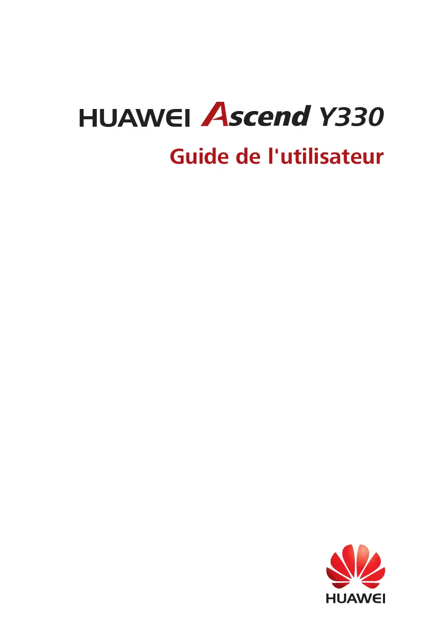 Ce guide est fourni à titre de référence uniquement. Le produit réel, y compris sa couleur, sa taille et la disposition de l'écran, peut s'avérer différent. Les déclarations, informations et recommandations de ce guide ne constituent aucunement une garantie, expresse ou tacite. Veuillez consulter le site http://consumer.huawei.com/en/support/hotline pour avoir accès aux dernières mises à jour de la hotline et des adresses email de votre pays ou région. Modèle : HUAWEI Y330-U01 V100R001_01