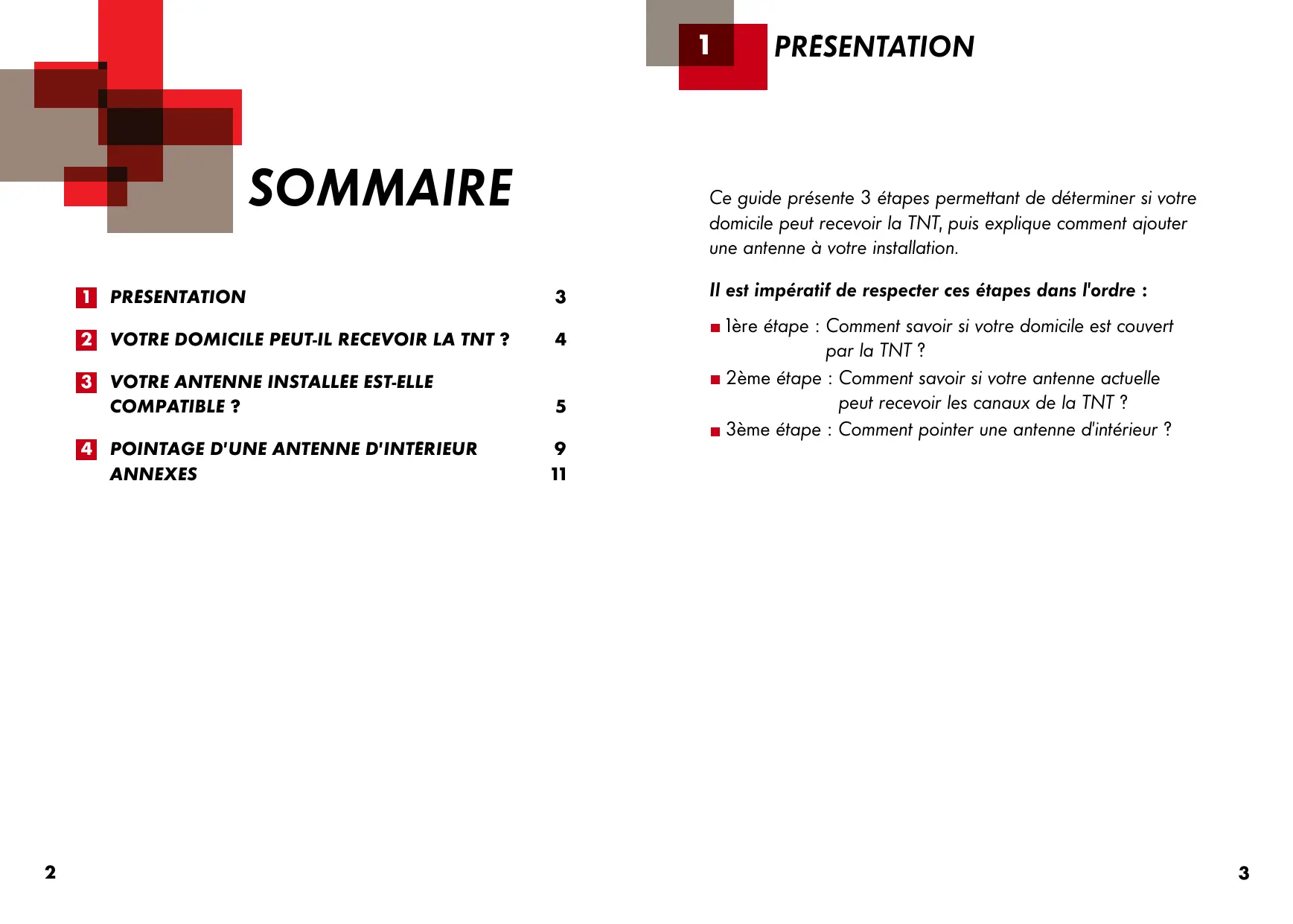 PRÉSENTATION PRÉSENTATION Ce guide présente 3 étapes permettant de déterminer si votre domicile peut recevoir la TNT, puis explique comment ajouter une antenne à votre installation.