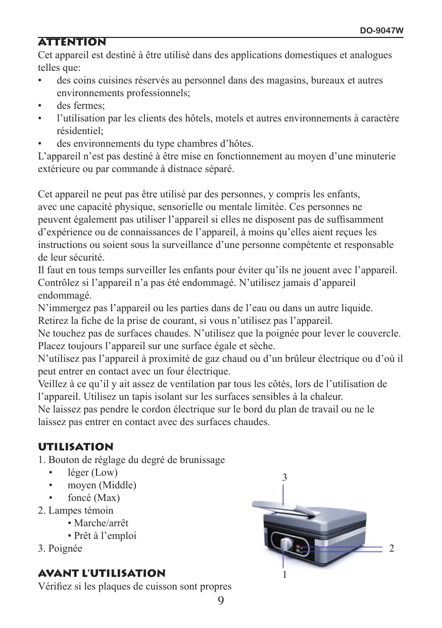 DO-9047W ATTENTION Cet appareil est destiné à être utilisé dans des applications domestiques et analogues telles que: