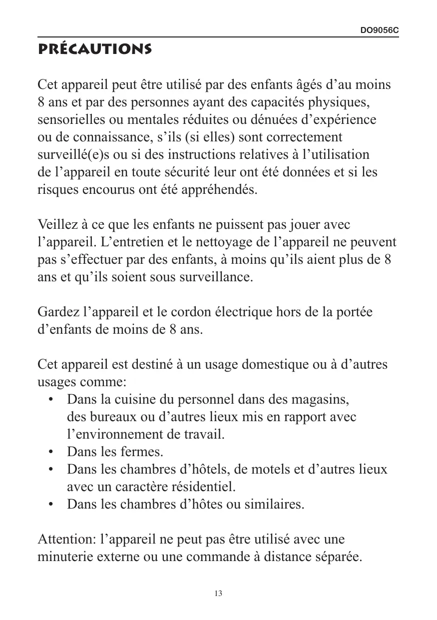 Attention: l'appareil ne peut pas etre utiliser avec une minuterie externe ou une commande a distance séparée.