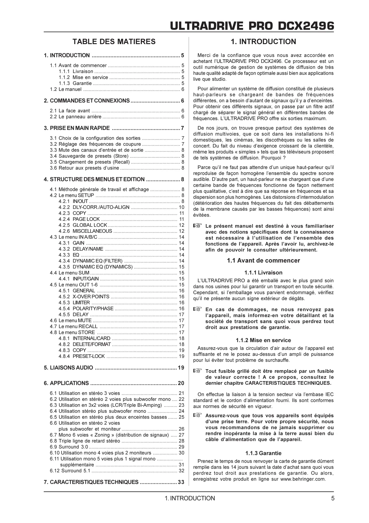 La société BEHRINGER apporte le plus grand soin à la fabrication de ses produits pour vous garantir la qualité. Des modifications nécessaires peuvent donc être effectues sans notification préalable. C'est jusquoi les caractéristiques et la configuration physique des produits peuvent différer des specifications et illustrations générées dans ce manuel.