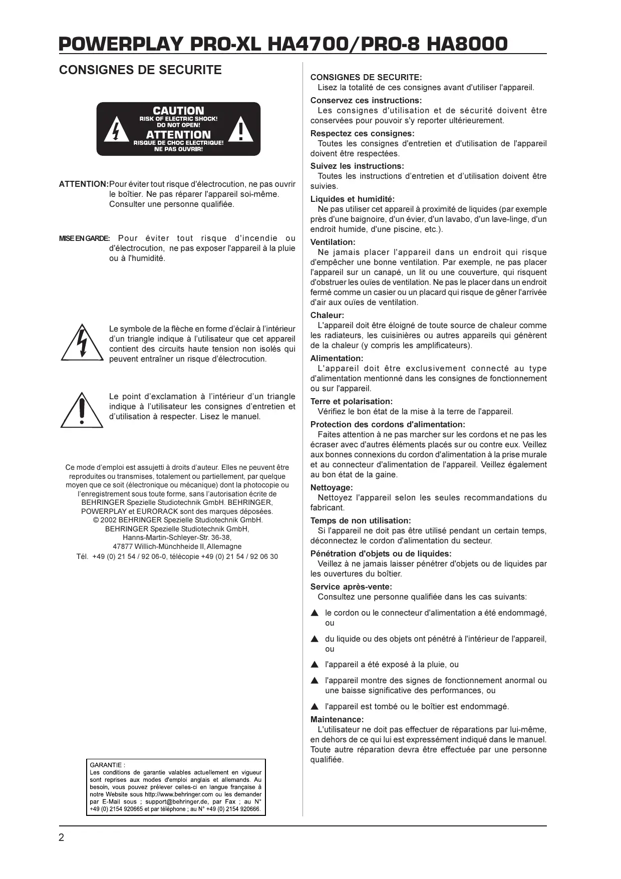 Les conditions de garantie valables actuellément en vigueur sont reprises aux modes d'emploi anglais et allemands. Au besoin, vous pouvez prélever celles-ci en langue française à notre Website sous http://www.behringer.com ou les demander par E-Mail sous , support@behringer.de, par Fax ; au N° +49 (0) 2154 920665 et par téléphone ; au N° +49 (0) 2154 920666.