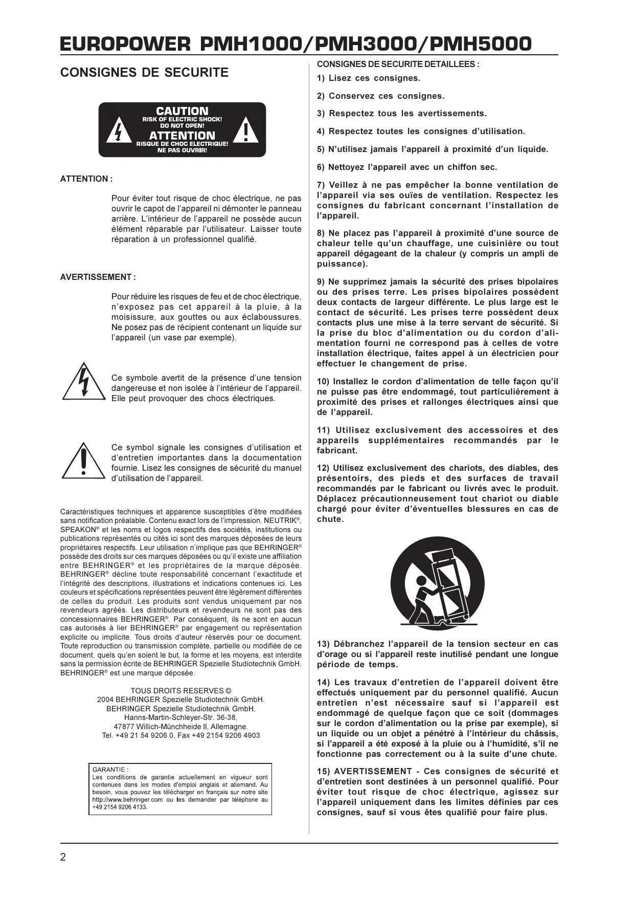 Les conditions de garantie actuellément en vigueur sont contenues dans les modes d'emploi angls et allemand. Au besoin, vous pouvez les télécharger en français sur notre site http://www.behringer.com ou les demander par téléphone au +49 2154 9206 4133.