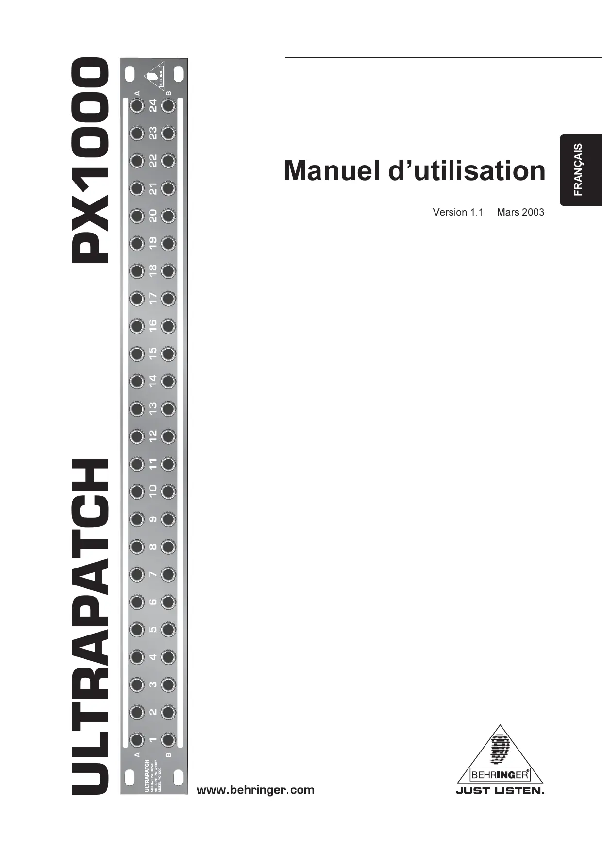 Merci de la confiance que vous avez accordedé à BEHRINGER en achetant l'ULTRAPATCH PX1000. Le PX1000 est un patchbay 48 points symétrique et polyvalent pour le studio et le live.