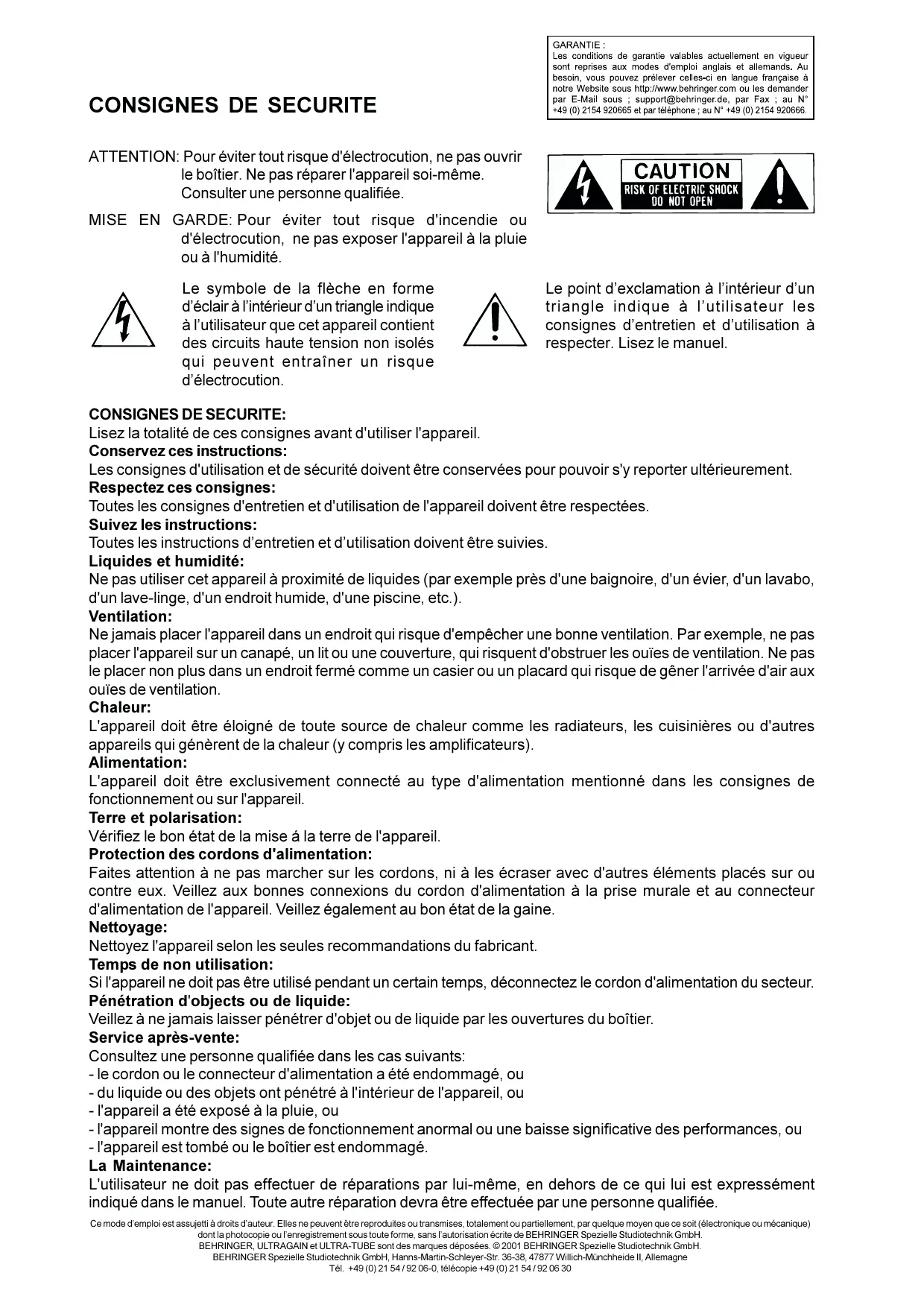 Les conditions de garantie valables actuellément en vigueur sont reprises aux modes d'emploi angls et allemands. Au besoin, vous pouvez prélever celles-ci en langue française à notre Website sous http://www.behringer.com ou les demander par E-Mail sous ; support@behringer.de, par Fax; au N^ +49 02154 920665 et par téléphone ; au N^ + 49 02154 920666.