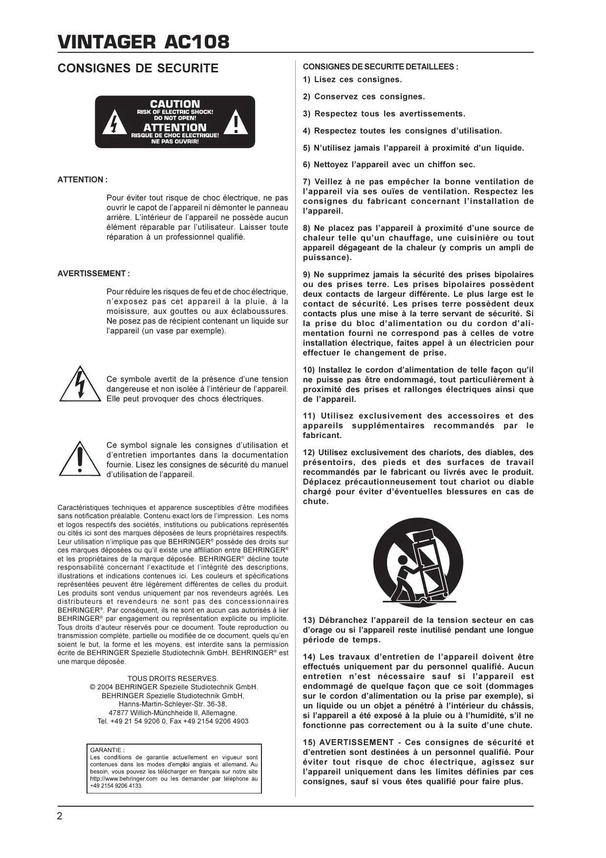 Les conditions de garantie actuellément en vigueur sont contenues dans les modes d'emploi anglais et allemand. Au besoin, vous pouvez les télécharger en français sur notre site http://www.behringer.com ou les demander par téléphone au +49 2154 9206 4133.