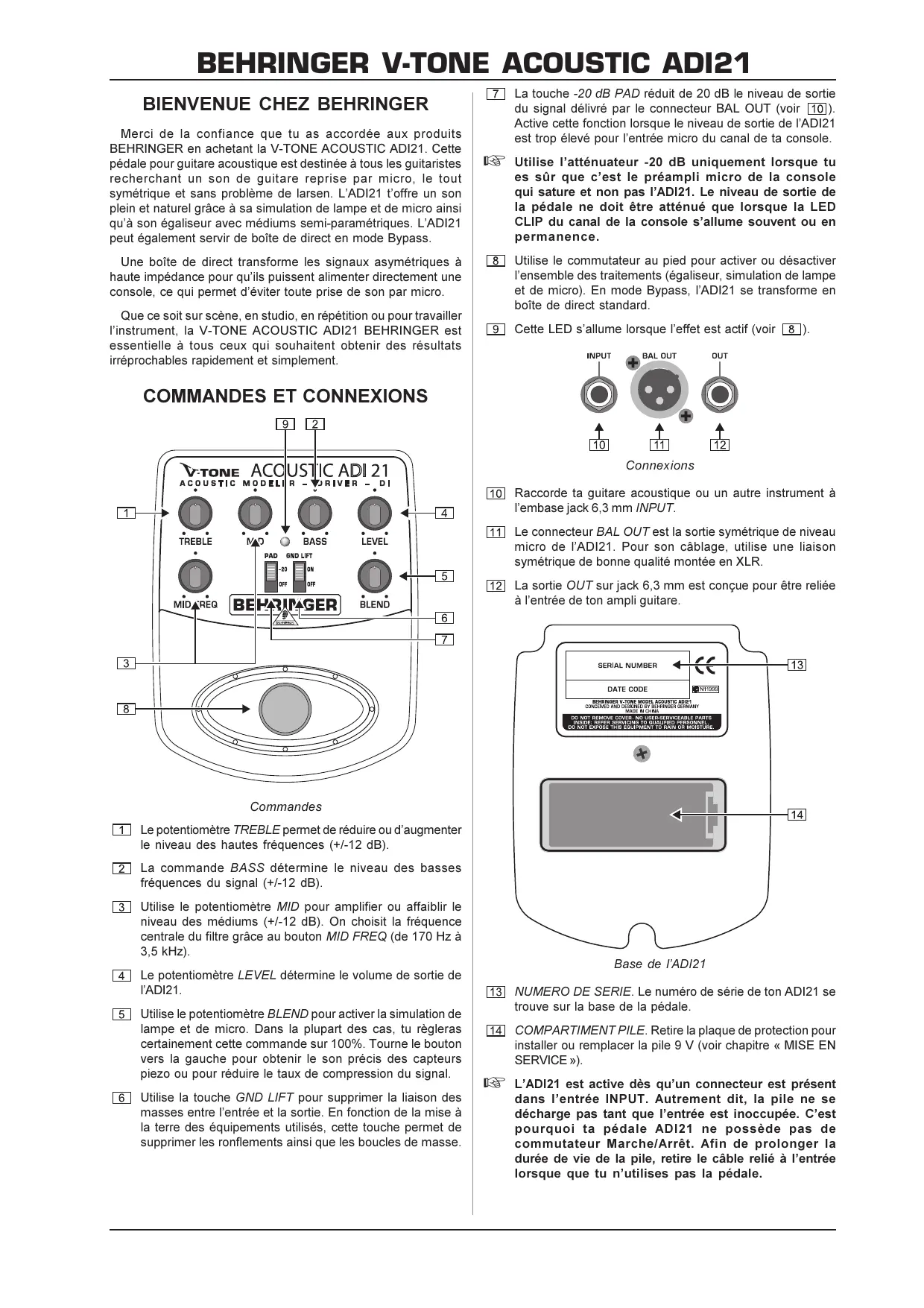 Merci de la confiance que tu as accordée aux produits BEHRINGER en achetant la V-TONE ACOUSTIC ADI21. Cette pédale pour guitare acoustique est destinée à tous les guitaristes recherchant un son de guitare reprise par micro, le tout symétrique et sans problème de larsen. L'ADI21 t'offre un son plein et naturel grâce à sa simulation de lampe et de micro ainsi qu'à son égaliseur avec mediums semi-paramétriques. L'ADI21 peut également servir de boîte de direct en mode Bypass.
