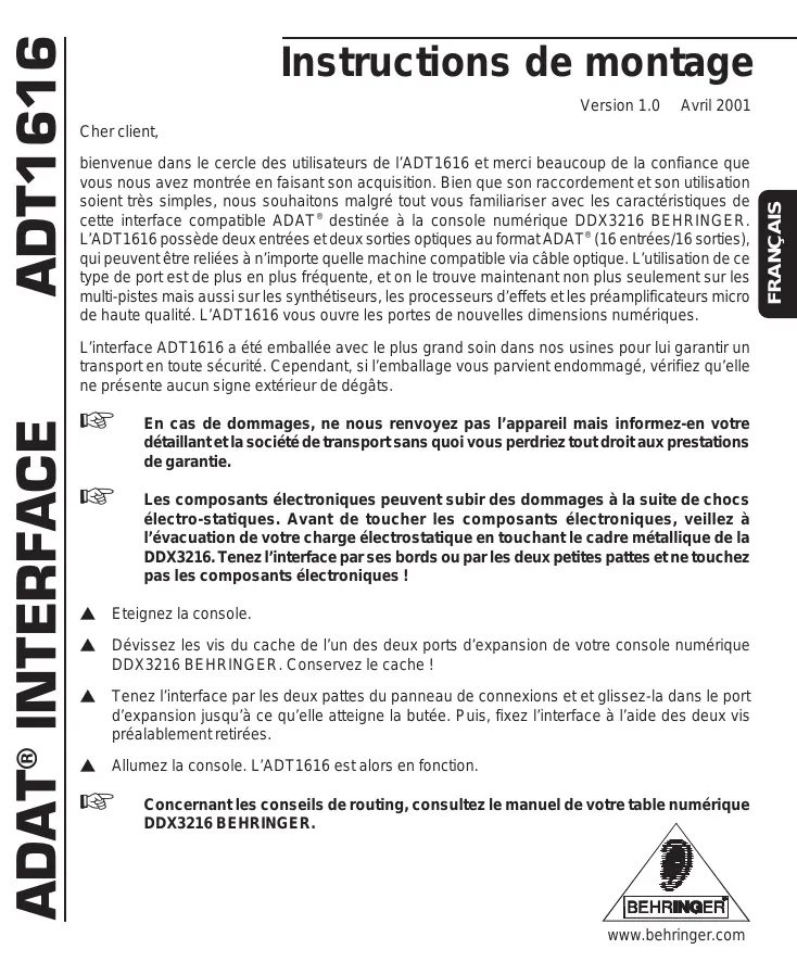 ADT1616 - Interface audio BEHRINGER - Notice d'utilisation et mode d'emploi gratuit