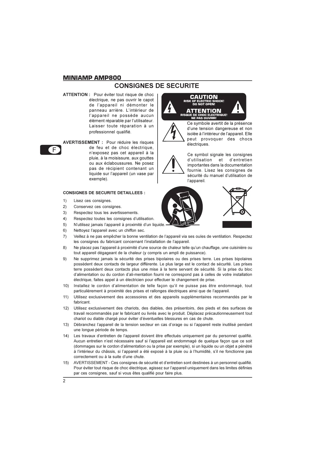 15) AVERTISSEMENT - Ces consignes de sécurité et d'entretien sont destinées à un personnel qualifié. Pour éviter tout risque de chic électrique, agissez sur l'appareil uniquement dans les limites définies par ces consignes, sauf si vous étés qualifié pour faire plus.