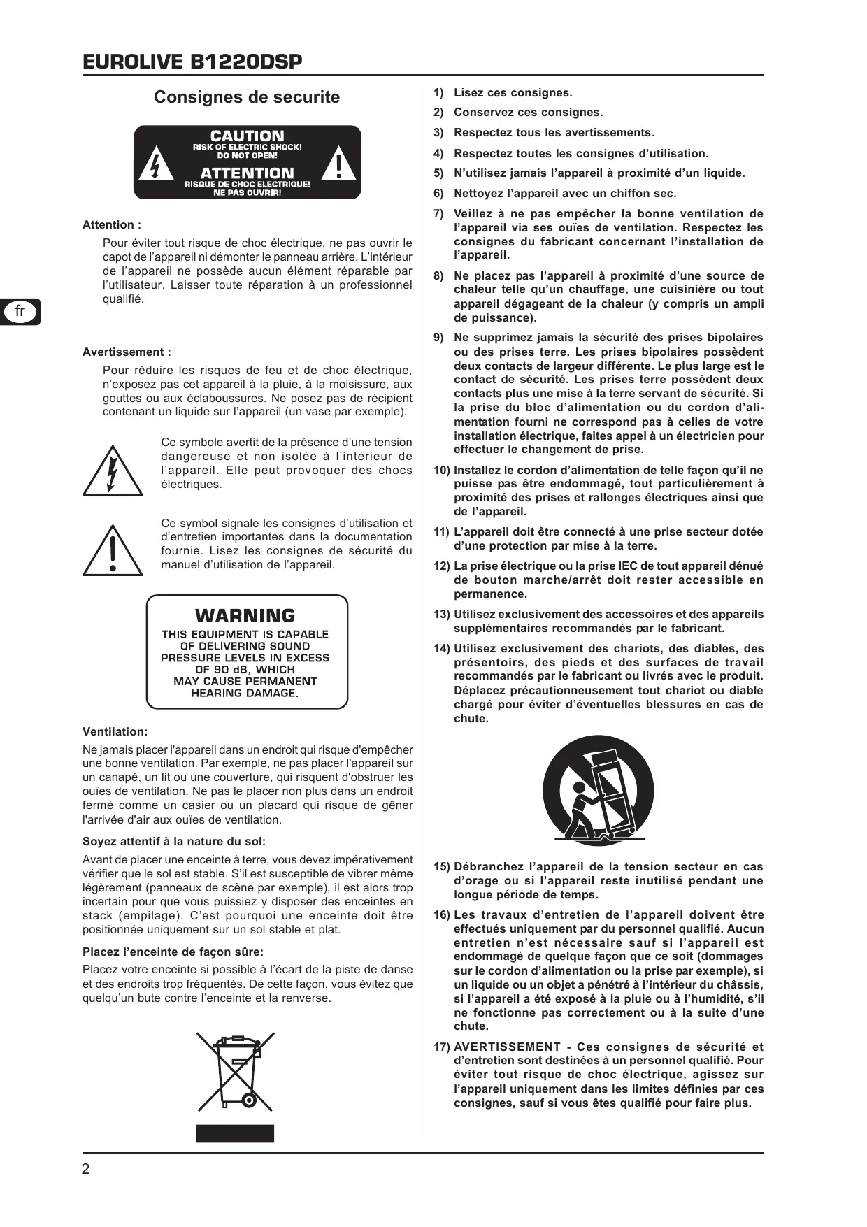 présentoirs, des pieds et des surfaces de travail recommandés par le fabricant ou livrés avec le produit. Déplacez précautionneusement tout chariot ou diable chargé pour éviter d’éventuelles blessures en cas de chute. Ventilation: Ne jamais placer l'appareil dans un endroit qui risque d'empêcher une bonne ventilation. Par exemple, ne pas placer l'appareil sur un canapé, un lit ou une couverture, qui risquent d'obstruer les ouïes de ventilation. Ne pas le placer non plus dans un endroit fermé comme un casier ou un placard qui risque de gêner l'arrivée d'air aux ouïes de ventilation. Soyez attentif à la nature du sol: Avant de placer une enceinte à terre, vous devez impérativement vérifier que le sol est stable. S’il est susceptible de vibrer même légèrement (panneaux de scène par exemple), il est alors trop incertain pour que vous puissiez y disposer des enceintes en stack (empilage). C’est pourquoi une enceinte doit être positionnée uniquement sur un sol stable et plat. Placez l’enceinte de façon sûre: Placez votre enceinte si possible à l’écart de la piste de danse et des endroits trop fréquentés. De cette façon, vous évitez que quelqu’un bute contre l’enceinte et la renverse.