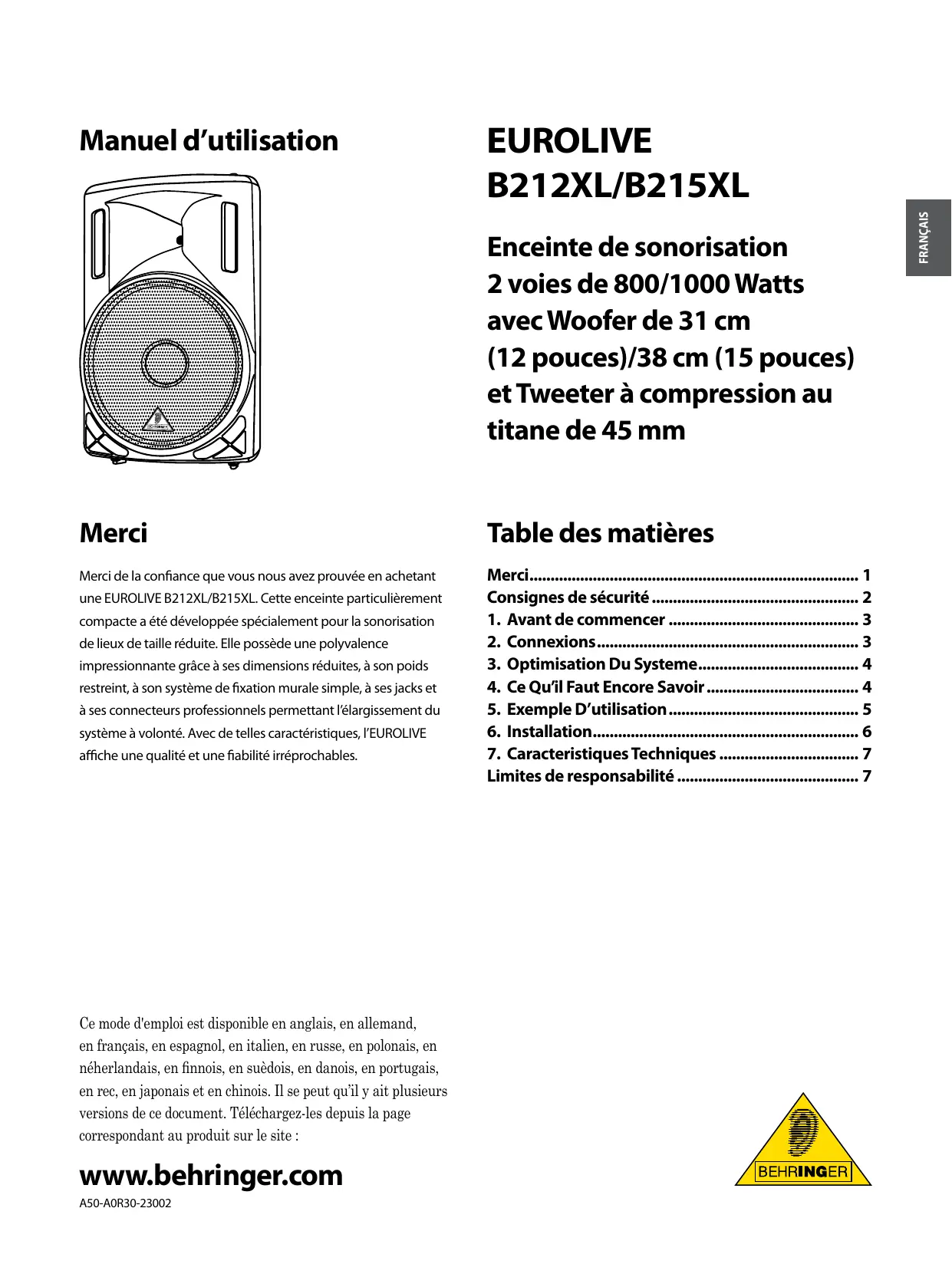 Merci de la confiance que vous nous avons prouvée en achetant une EUROLIVE B212XL/B215XL. Cette enceinte particulièrement compacte a été développée spécialement pour la sonorisation de lieux de taille réduite. Elle possède une polyvalence impressionnante grâce à ses dimensions réduites, à son poids restreint, à son système de fixation murale simple, à ses jacks et à ses connecteurs professionnels permettant l'élargissement du système à volonté. Avec de telles caractéristiques, l'EUROLIVE affiche une qualité et une fiabilité irréprochables.