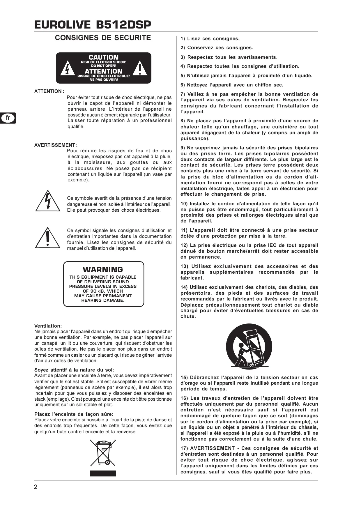 - Dautres dispositions sont en vigueur pour les clients de lUnion Européenne. Pour tout complément dinformation, les clients de lUE peuvent contacter lassistance française BEHRINGER. En cas de dommages, ne nous renvoyez pas lenceinte mais informez votre détaillant et la société de transport sans quoi vous perdrez tout droit aux prestations de garantie. Veuillez toujours utiliser lemballage dorigine pour stocker ou expédier votre B512DSP. Ne laissez jamais denfant sans surveillance jouer avec lenceinte ou son emballage. Veillez à respecter lenvironnement si vous jetez tout ou partie de lemballage.