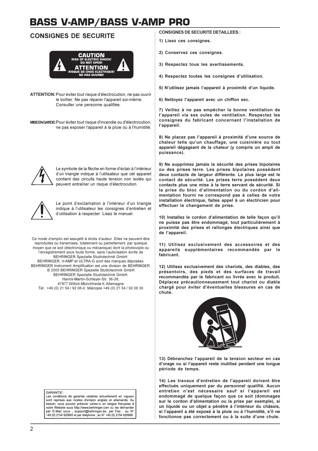 Ce mode d'emploi est assujetti à droits d'auteur. Elles ne peuvent être reproduites ou transmises, totalement ou partiellement, par quelque moyen que ce soit (électronique ou mécanique) dont la photocopie ou l'enregistrement sous toute forme, sans l'autorisation écrite de BEHRINGER Spezielle Studiotechnik GmbH. BEHRINGER, V-AMP et ULTRA-G sont des marques déposées. BEHRINGER Instrument Amplification est une division de BEHRINGER © 2003 BEHRINGER Spezielle Studiotechnik GmbH. BEHRINGER Spezielle Studiotechnik GmbH, Hanns-Martin-Schleyer-Str. 36-38, 47877 Willich-Münchheide II, Allemagne Tél. +49 (0) 21 54 / 92 06-0, télécopie +49 (0) 21 54 / 92 06 30