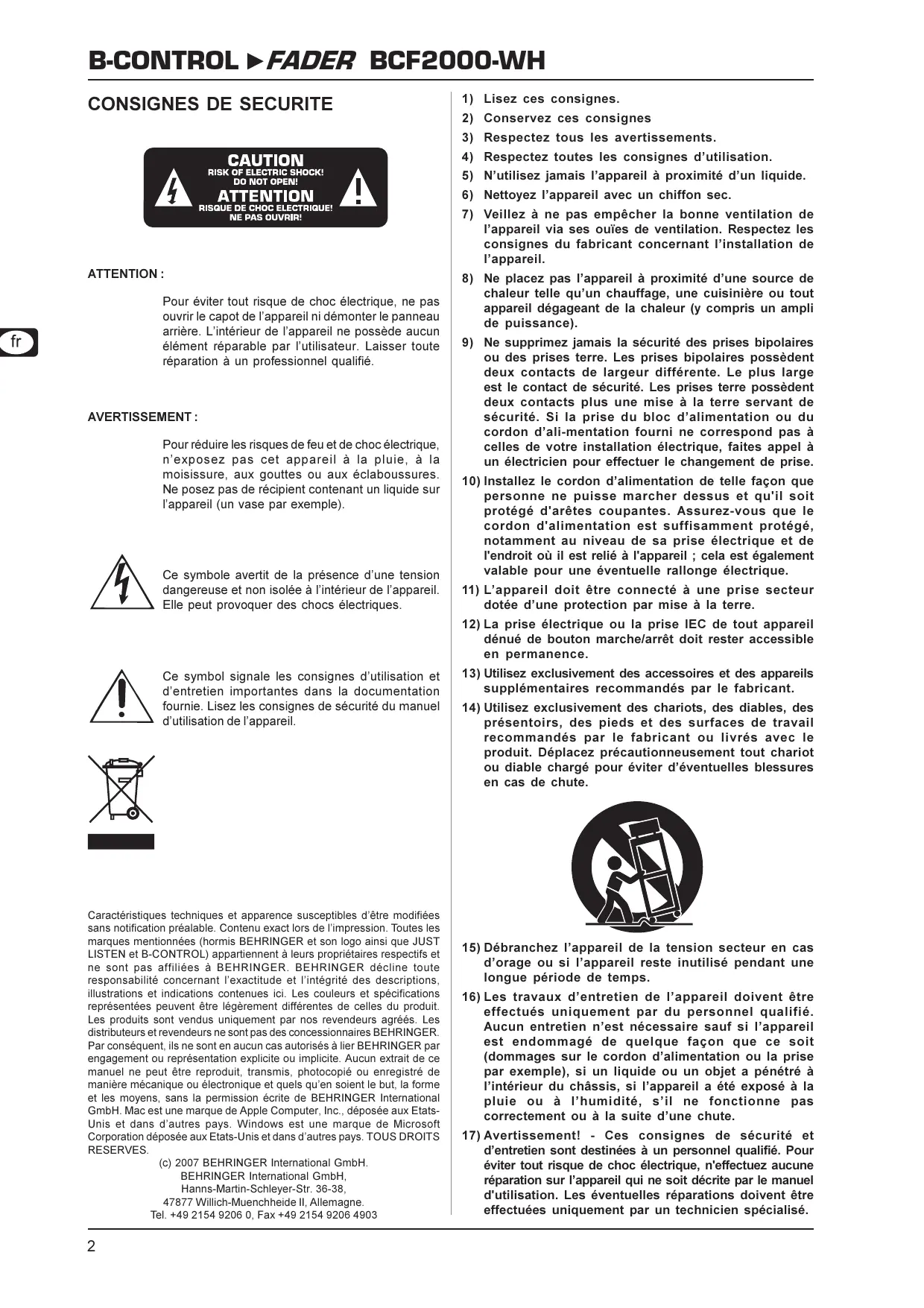 dénué de bouton marche/arrêt doit rester accessible en permanence. Ce symbol signale les consignes dutilisation et dentretien importantes dans la documentation fournie. Lisez les consignes de sécurité du manuel dutilisation de lappareil. Caractéristiques techniques et apparence susceptibles dêtre modifiées sans notification préalable. Contenu exact lors de limpression. Toutes les marques mentionnées (hormis BEHRINGER et son logo ainsi que JUST LISTEN et B-CONTROL) appartiennent à leurs propriétaires respectifs et ne sont pas affiliées à BEHRINGER. BEHRINGER décline toute responsabilité concernant lexactitude et lintégrité des descriptions, illustrations et indications contenues ici. Les couleurs et spécifications représentées peuvent être légèrement différentes de celles du produit. Les produits sont vendus uniquement par nos revendeurs agréés. Les distributeurs et revendeurs ne sont pas des concessionnaires BEHRINGER. Par conséquent, ils ne sont en aucun cas autorisés à lier BEHRINGER par engagement ou représentation explicite ou implicite. Aucun extrait de ce manuel ne peut être reproduit, transmis, photocopié ou enregistré de manière mécanique ou électronique et quels quen soient le but, la forme et les moyens, sans la permission écrite de BEHRINGER International GmbH. Mac est une marque de Apple Computer, Inc., déposée aux EtatsUnis et dans dautres pays. Windows est une marque de Microsoft Corporation déposée aux Etats-Unis et dans dautres pays. TOUS DROITS RESERVES. (c) 2007 BEHRINGER International GmbH. BEHRINGER International GmbH, Hanns-Martin-Schleyer-Str. 36-38, 47877 Willich-Muenchheide II, Allemagne. Tel. +49 2154 9206 0, Fax +49 2154 9206 4903