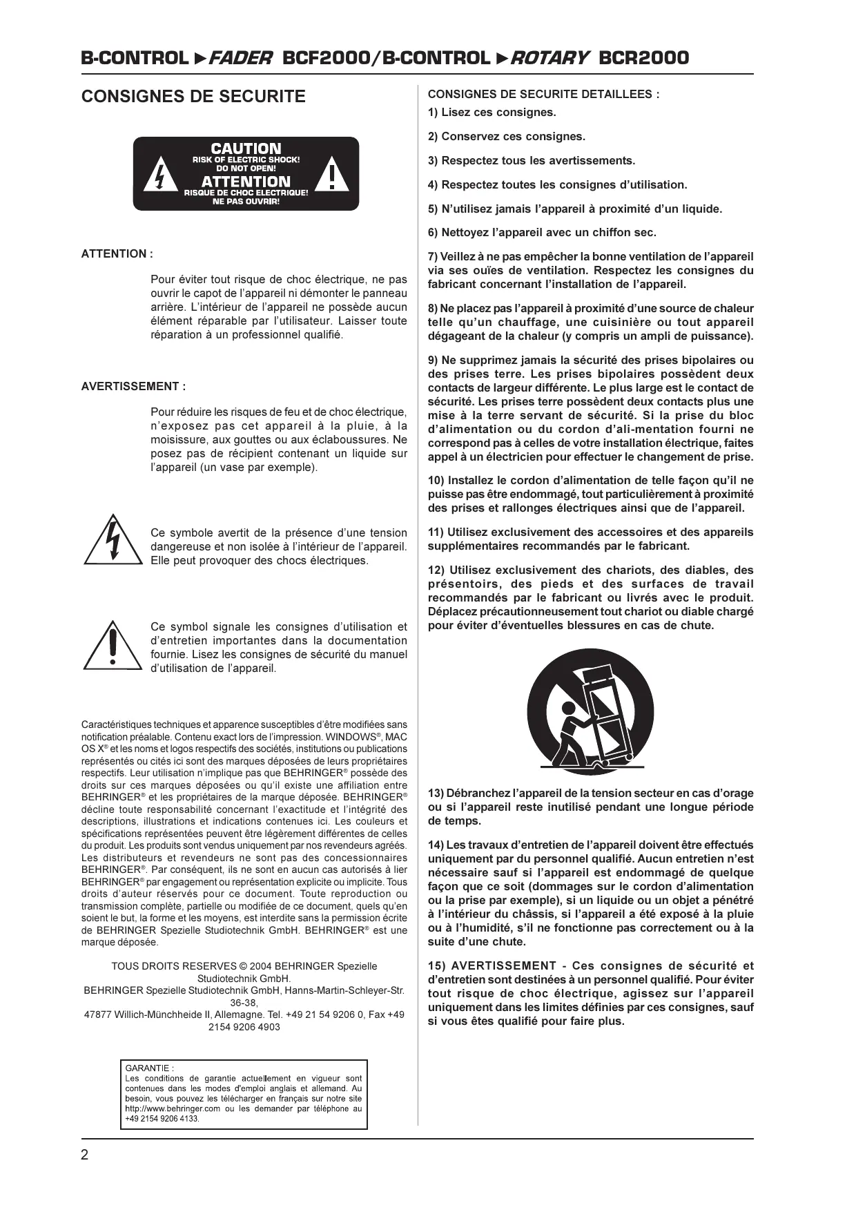 Pour réduire les risques de feu et de choc électrique, nexposez pas cet appareil à la pluie, à la moisissure, aux gouttes ou aux éclaboussures. Ne posez pas de récipient contenant un liquide sur lappareil (un vase par exemple). Ce symbole avertit de la présence dune tension dangereuse et non isolée à lintérieur de lappareil. Elle peut provoquer des chocs électriques. Ce symbol signale les consignes dutilisation et dentretien importantes dans la documentation fournie. Lisez les consignes de sécurité du manuel dutilisation de lappareil. Caractéristiques techniques et apparence susceptibles dêtre modifiées sans notification préalable. Contenu exact lors de limpression. WINDOWS®, MAC OS X® et les noms et logos respectifs des sociétés, institutions ou publications représentés ou cités ici sont des marques déposées de leurs propriétaires respectifs. Leur utilisation nimplique pas que BEHRINGER® possède des droits sur ces marques déposées ou quil existe une affiliation entre BEHRINGER® et les propriétaires de la marque déposée. BEHRINGER® décline toute responsabilité concernant lexactitude et lintégrité des descriptions, illustrations et indications contenues ici. Les couleurs et spécifications représentées peuvent être légèrement différentes de celles du produit. Les produits sont vendus uniquement par nos revendeurs agréés. Les distributeurs et revendeurs ne sont pas des concessionnaires BEHRINGER®. Par conséquent, ils ne sont en aucun cas autorisés à lier BEHRINGER® par engagement ou représentation explicite ou implicite. Tous droits dauteur réservés pour ce document. Toute reproduction ou transmission complète, partielle ou modifiée de ce document, quels quen soient le but, la forme et les moyens, est interdite sans la permission écrite de BEHRINGER Spezielle Studiotechnik GmbH. BEHRINGER® est une marque déposée. TOUS DROITS RESERVES © 2004 BEHRINGER Spezielle Studiotechnik GmbH. BEHRINGER Spezielle Studiotechnik GmbH, Hanns-Martin-Schleyer-Str. 36-38, 47877 Willich-Münchheide II, Allemagne. Tel. +49 21 54 9206 0, Fax +49