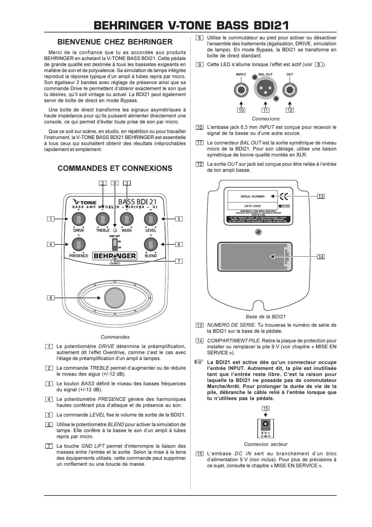Merci de la confiance que tu as accordée aux produits BEHRINGER en achetant la V-TONE BASS BDI21. Cette pédale de grande qualité est destinée à tous les bassistes exigeants en matière de son et de polyvalence. Sa simulation de lampe intégrée produit la réponse typique d'un ampli à tubes repris par micro. Son égaliseur 2 bandes avec réglage de présence ainsi que sa commande Drive te permettent d'obtenir exactement le son que tu désies, qu'il soit vintage ou actuel. La BDI21 peut également servir de boîte de direct en mode Bypass.