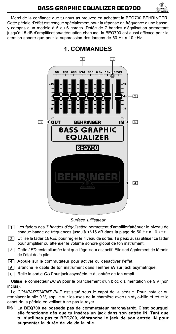 Merci de la confiance que tu nous as prouvée en achetant la BEQ700 BEHRINGER. Cette pedale d'effet est concise spécialement pour la réponse en fréquence d'uneasse, y compris d'un modele à 5 ou 6 cordes. Dotee de 7 bandes d'égalisation permettant jusqu'à 15 dB d'amplification/atténuation chacune, la BEQ700 est aussi efficace pour la création sonore que pour la suppression des larsens de 50Hz à 10kHz .