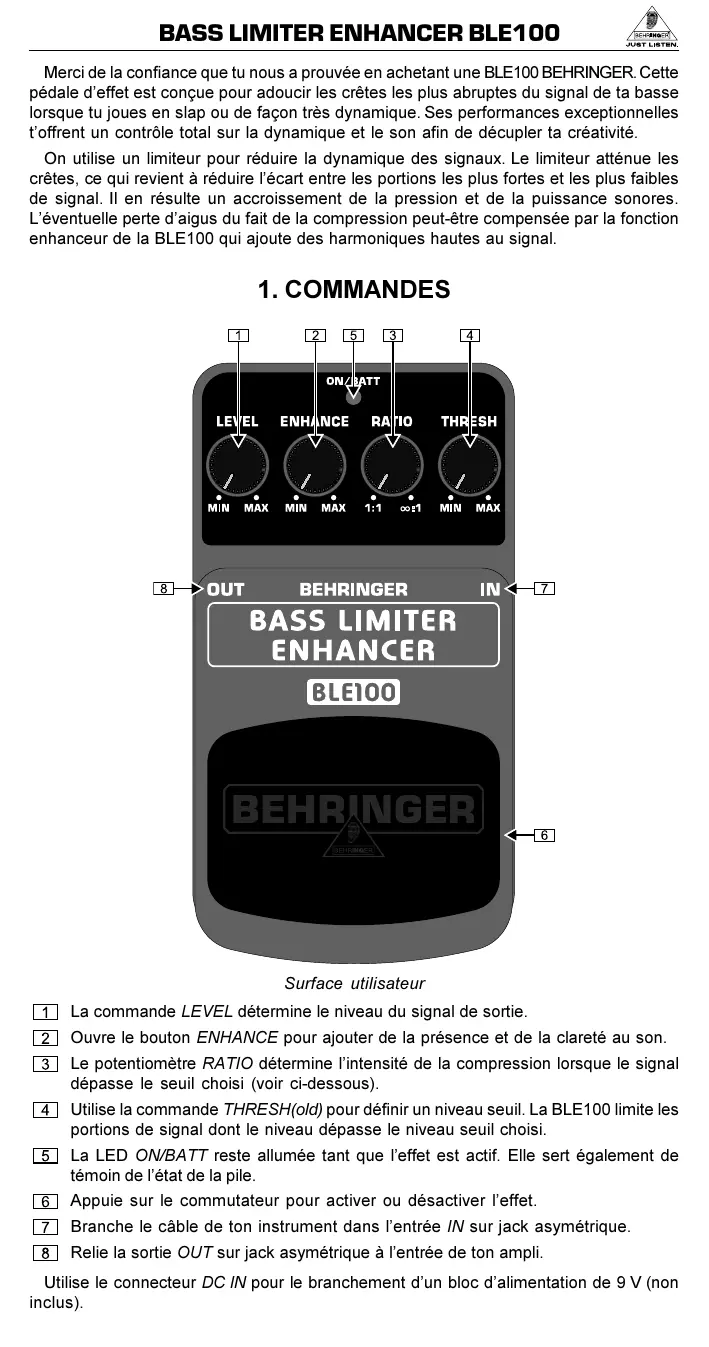 Merci de la confiance que tu nous a prouvée en achetant une BLE100 BEHRINGER. Cette pédale d'effet est donc pour adoucir les créées les plus abruptes du signal de ta basse lorsque tu joues en slap ou de façon très dynamique. Ses performances exceptionnelles t'offrent un contrôle total sur la dynamique et le son afin de découper ta créativité.