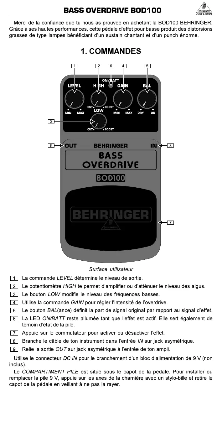 BOD100 - Pédale d'effet pour guitare BEHRINGER - Notice d'utilisation et mode d'emploi gratuit