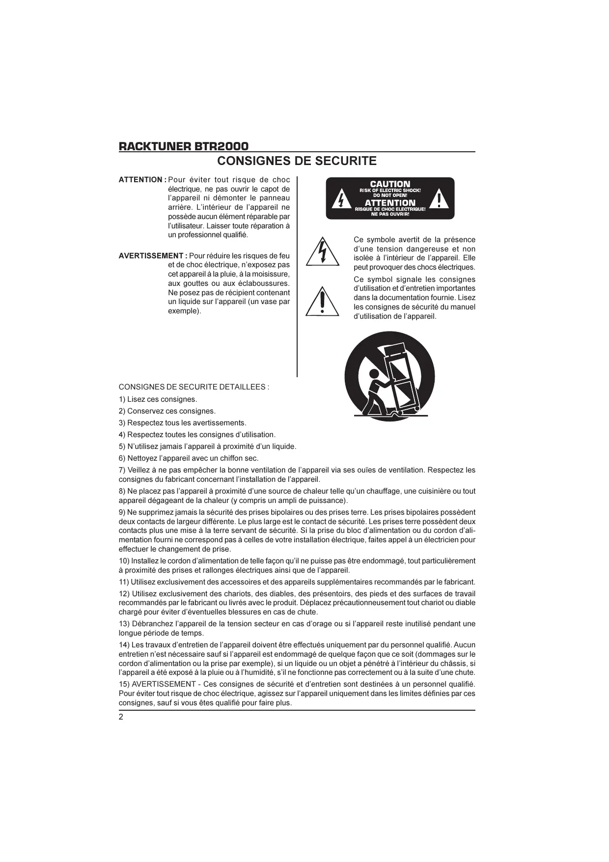 15) AVERTISSEMENT - Ces consignes de sécurité et d'entretien sont destinées à un personnel qualifié. Pour éviter tout risque de chic électrique, agissez sur l'appareil uniquement dans les limites définies par ces consignes, sauf si vous étés qualifié pour faire plus.