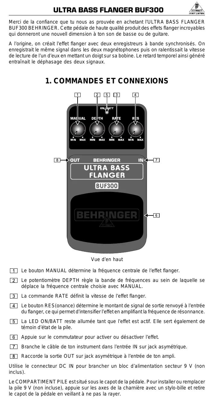 Merci de la confiance que tu nous as prouvée en achetant l'ULTRA BASS FLANGER BUF300 BEHRINGER. Cette pédale de haute qualité produit des effets flanger incroyables quiodonrent une nouvelle dimension à ton son de basse ou de guitare.