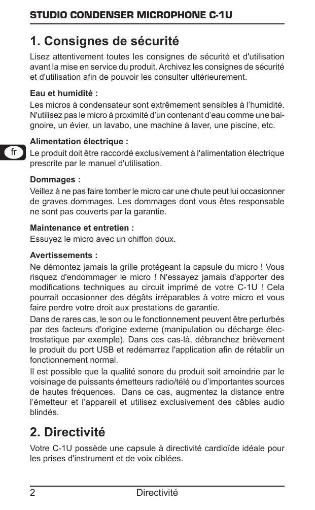 Ne démonze jamais la grille protégeant la capsule du micro! Vous risquez d'endommager le micro! N'essayez jamais d'apporter des modifications techniques au circuit imprimé de votre C-1U! Cela pourrait occasionner des dégats irréparables à votre micro et vous faire perdre votre droit aux prestations de garantie.