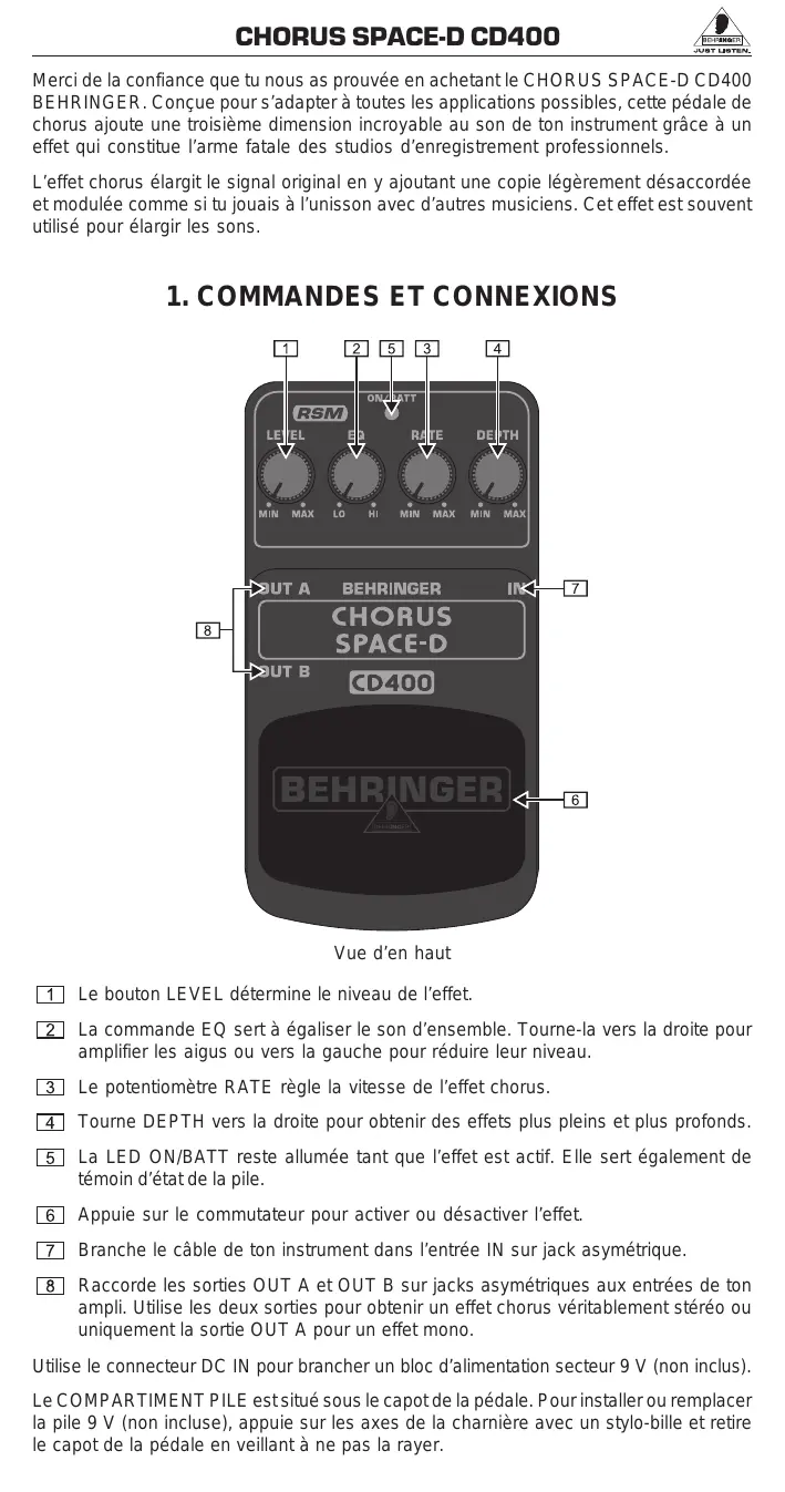 Merci de la confiance que tu nous as prouvée en achetant le CHORUS SPACE-D CD400 BEHRINGER. Conçue pour s'adapter à toutes les applications possibles, cette pédale de chorus ajoute une troisième dimension incroyable au son de ton instrument grâce à un effet qui constitue l'arme fatale des studios d'enregistrement professionnelns.