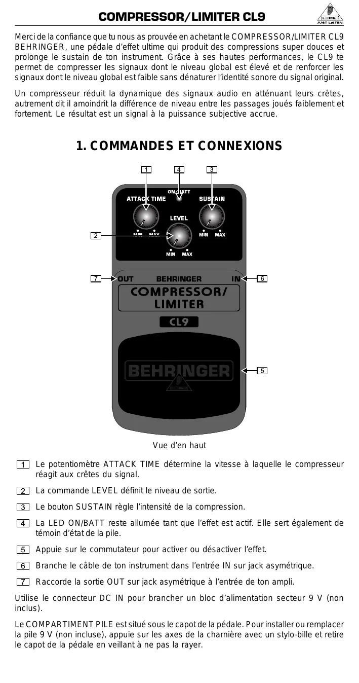 Merci de la confiance que tu nous as prouvée en achetant le COMPRESSOR/LIMITER CL9 BEHRINGER, une pédale d'effet ultime qui produit des compressions super douces et prolonge le sustain de ton instrument. Gracé à ses haute performances, le CL9 te permet de compressor les signaux dont le niveau global est élevé et de renforcer les signaux dont le niveau global est faible sans dénaturer l'identité sonore du signal original.