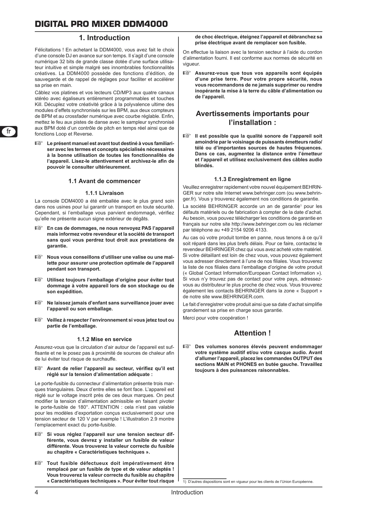 La console DDM4000 a été emballée avec le plus grand soin dans nos usines pour lui garantir un transport en toute sécurité. Cependant, si l’emballage vous parvient endommagé, vérifiez qu’elle ne présente aucun signe extérieur de dégâts. ++ En cas de dommages, ne nous renvoyez PAS l’appareil mais informez votre revendeur et la société de transport sans quoi vous perdrez tout droit aux prestations de garantie. ++ Nous vous conseillons d’utiliser une valise ou une mallette pour assurer une protection optimale de l’appareil pendant son transport. ++ Utilisez toujours l’emballage d’origine pour éviter tout dommage à votre appareil lors de son stockage ou de son expédition. ++ Ne laissez jamais d’enfant sans surveillance jouer avec l’appareil ou son emballage. ++ Veillez à respecter l’environnement si vous jetez tout ou partie de l’emballage. Veuillez enregistrer rapidement votre nouvel équipement BEHRINGER sur notre site Internet www.behringer.com (ou www.behringer.fr). Vous y trouverez également nos conditions de garantie. La société BEHRINGER accorde un an de garantie1 pour les défauts matériels ou de fabrication à compter de la date d’achat. Au besoin, vous pouvez télécharger les conditions de garantie en français sur notre site http://www.behringer.com ou les réclamer par téléphone au +49 2154 9206 4133. Au cas où votre produit tombe en panne, nous tenons à ce qu’il soit réparé dans les plus brefs délais. Pour ce faire, contactez le revendeur BEHRINGER chez qui vous avez acheté votre matériel. Si votre détaillant est loin de chez vous, vous pouvez également vous adresser directement à l’une de nos filiales. Vous trouverez la liste de nos filiales dans l’emballage d’origine de votre produit (« Global Contact Information/European Contact Information »). Si vous n’y trouvez pas de contact pour votre pays, adressezvous au distributeur le plus proche de chez vous. Vous trouverez également les contacts BEHRINGER dans la zone « Support » de notre site www.BEHRINGER.com. Le fait d’enregistrer votre produit ainsi que sa date d’achat simplifie grandement sa prise en charge sous garantie. Merci pour votre coopération ! Attention !