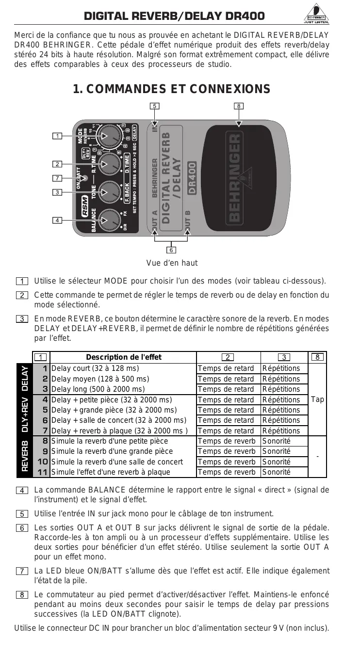 DR400 - Pédale d'effet pour guitare BEHRINGER - Notice d'utilisation et mode d'emploi gratuit