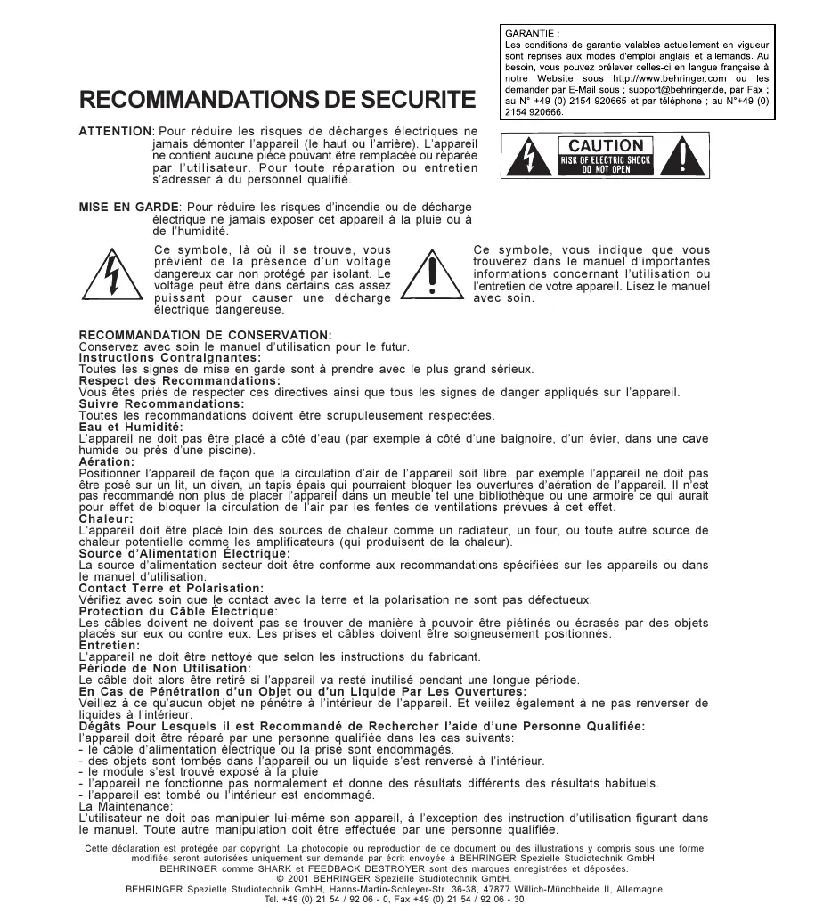 ATTENTION: Pour réduire les risques de décharges électriques ne jamais démonter lappareil (le haut ou larrière). Lappareil ne contient aucune pièce pouvant être remplacée ou réparée par lutilisateur. Pour toute réparation ou entretien sadresser à du personnel qualifié. MISE EN GARDE: Pour réduire les risques dincendie ou de décharge électrique ne jamais exposer cet appareil à la pluie ou à de lhumidité. Ce symbole, là où il se trouve, vous Ce symbole, vous indique que vous prévient de la présence dun voltage trouverez dans le manuel dimportantes dangereux car non protégé par isolant. Le informations concernant lutilisation ou voltage peut être dans certains cas assez lentretien de votre appareil. Lisez le manuel puissant pour causer une décharge avec soin. électrique dangereuse. RECOMMANDATION DE CONSERVATION: Conservez avec soin le manuel dutilisation pour le futur. Instructions Contraignantes: Toutes les signes de mise en garde sont à prendre avec le plus grand sérieux. Respect des Recommandations: Vous êtes priés de respecter ces directives ainsi que tous les signes de danger appliqués sur lappareil. Suivre Recommandations: Toutes les recommandations doivent être scrupuleusement respectées. Eau et Humidité: Lappareil ne doit pas être placé à côté deau (par exemple à côté dune baignoire, dun évier, dans une cave humide ou près dune piscine). Aération: Positionner lappareil de façon que la circulation dair de lappareil soit libre. par exemple lappareil ne doit pas être posé sur un lit, un divan, un tapis épais qui pourraient bloquer les ouvertures daération de lappareil. Il nest pas recommandé non plus de placer lappareil dans un meuble tel une bibliothèque ou une armoire ce qui aurait pour effet de bloquer la circulation de lair par les fentes de ventilations prévues à cet effet. Chaleur: Lappareil doit être placé loin des sources de chaleur comme un radiateur, un four, ou toute autre source de chaleur potentielle comme les amplificateurs (qui produisent de la chaleur). Source dAlimentation Électrique: La source dalimentation secteur doit être conforme aux recommandations spécifiées sur les appareils ou dans le manuel dutilisation. Contact Terre et Polarisation: Vérifiez avec soin que le contact avec la terre et la polarisation ne sont pas défectueux. Protection du Câble Électrique: Les câbles doivent ne doivent pas se trouver de manière à pouvoir être piétinés ou écrasés par des objets placés sur eux ou contre eux. Les prises et câbles doivent être soigneusement positionnés. Entretien: Lappareil ne doit être nettoyé que selon les instructions du fabricant. Période de Non Utilisation: Le câble doit alors être retiré si lappareil va resté inutilisé pendant une longue période. En Cas de Pénétration dun Objet ou dun Liquide Par Les Ouvertures: Veillez à ce quaucun objet ne pénétre à lintérieur de lappareil. Et veiilez également à ne pas renverser de liquides à lintérieur. Dégâts Pour Lesquels il est Recommandé de Rechercher laide dune Personne Qualifiée: lappareil doit être réparé par une personne qualifiée dans les cas suivants: - le câble dalimentation électrique ou la prise sont endommagés. - des objets sont tombés dans lappareil ou un liquide sest renversé à lintérieur. - le module sest trouvé exposé à la pluie - lappareil ne fonctionne pas normalement et donne des résultats différents des résultats habituels. - lappareil est tombé ou lintérieur est endommagé. La Maintenance: Lutilisateur ne doit pas manipuler lui-même son appareil, à lexception des instruction dutilisation figurant dans le manuel. Toute autre manipulation doit être effectuée par une personne qualifiée. Cette déclaration est protégée par copyright. La photocopie ou reproduction de ce document ou des illustrations y compris sous une forme modifiée seront autorisées uniquement sur demande par écrit envoyée à BEHRINGER Spezielle Studiotechnik GmbH. BEHRINGER comme SHARK et FEEDBACK DESTROYER sont des marques enregistrées et déposées. © 2001 BEHRINGER Spezielle Studiotechnik GmbH. BEHRINGER Spezielle Studiotechnik GmbH, Hanns-Martin-Schleyer-Str. 36-38, 47877 Willich-Münchheide II, Allemagne Tel. +49 (0) 21 54 / 92 06 - 0, Fax +49 (0) 21 54 / 92 06 - 30 SHARK DSP110