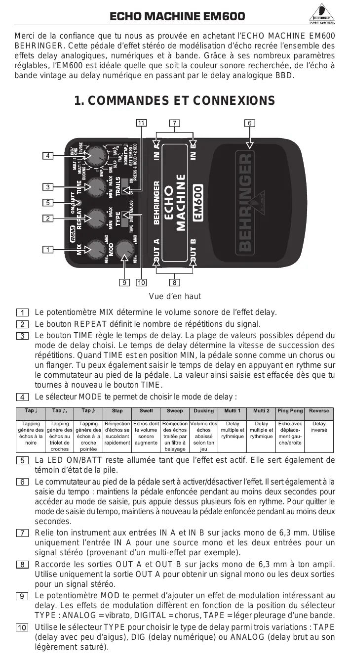 EM600 - Effets de guitare BEHRINGER - Notice d'utilisation et mode d'emploi gratuit