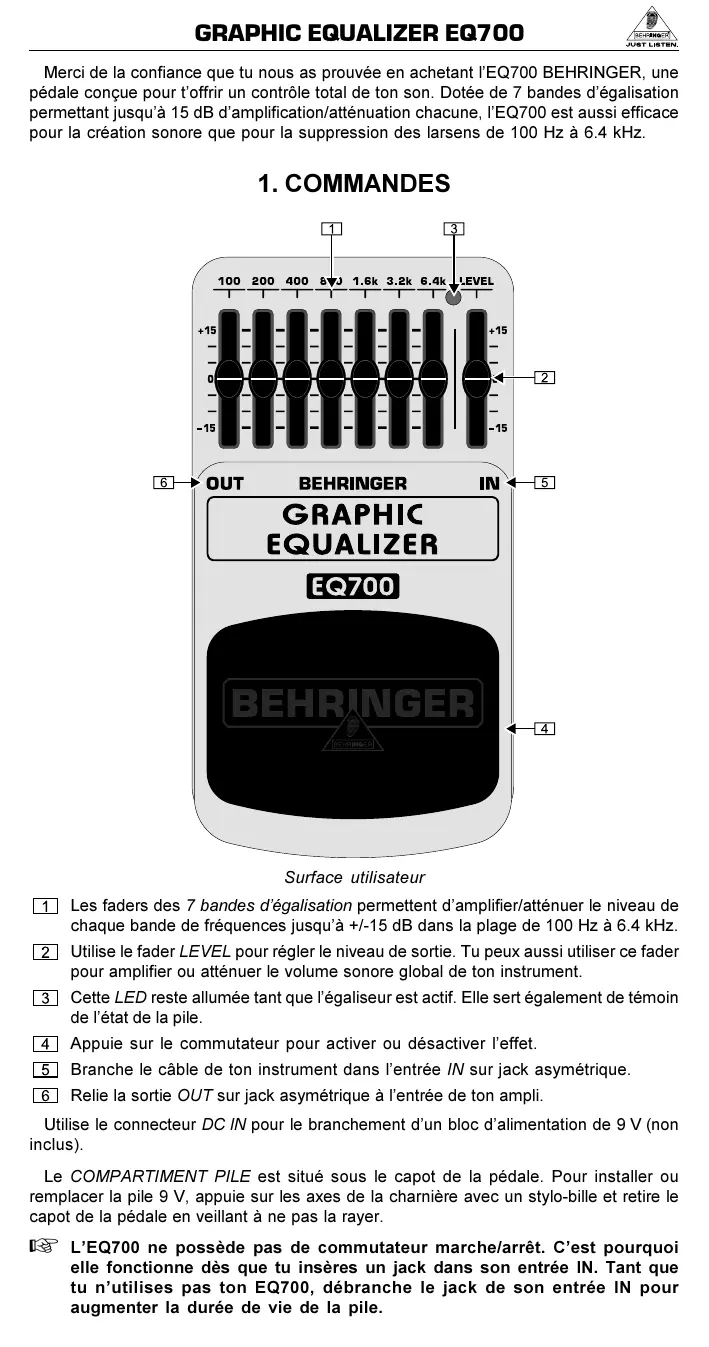 Merci de la confiance que tu nous as prouvée en achetant l'EQ700 BEHRINGER, une pedale concue pour t'offrir un contrôle total de ton son. Dotee de 7 bandes d'égalisation permettant jusqu'à 15 dB d'amplification/atténuation chacune, l'EQ700 est aussi efficace pour la création sonore que pour la suppression des larsens de 100 Hz à 6.4 kHz.