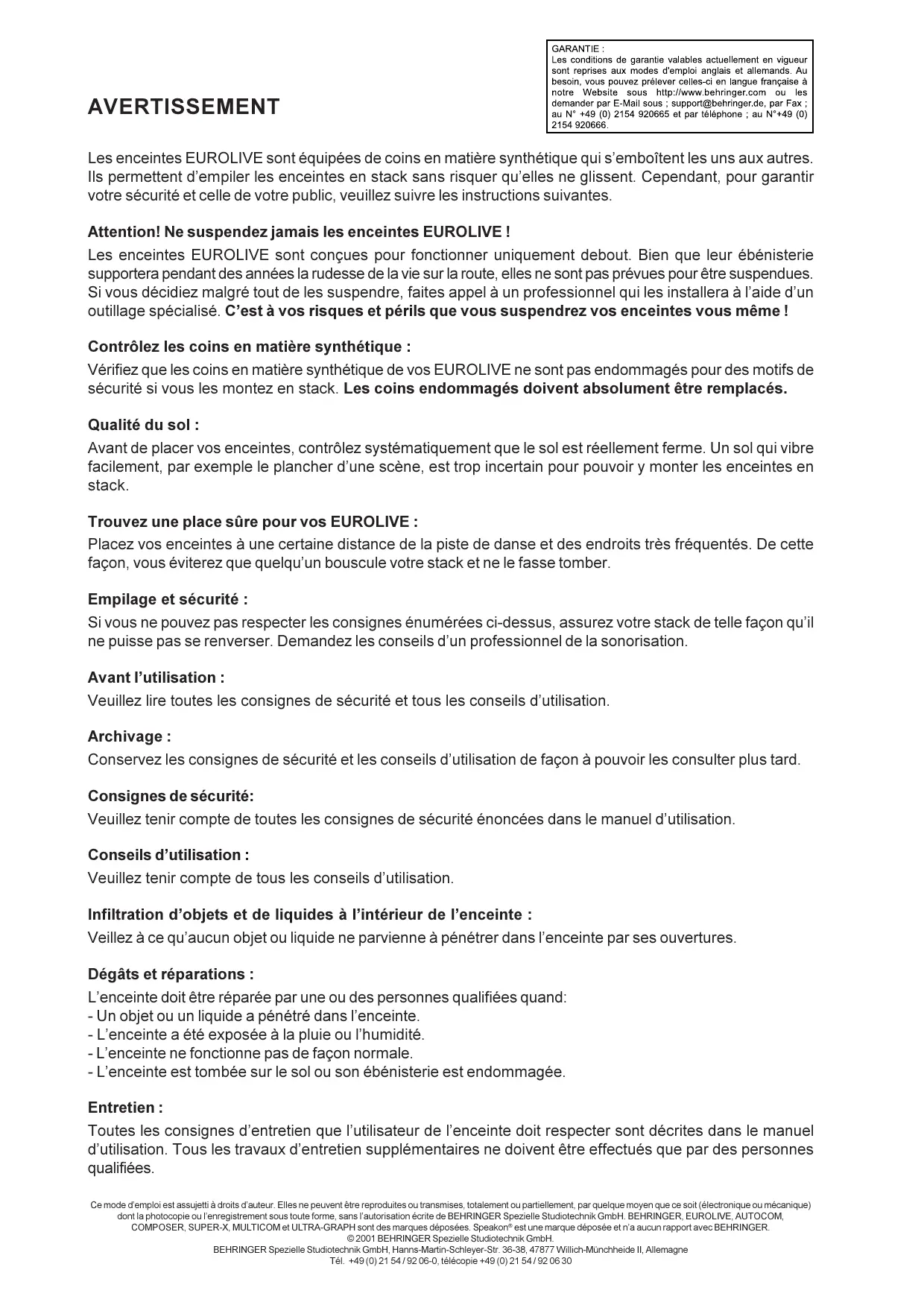 En achetant les EUROLIVE BEHRINGER, vous avons fait l'acquisition d'un système d'enceintes de sonorisation de très grande qualité. Vous possédez maintainant au moins un des éléments constituant un système polyvalent qui diffusera votre musique de façon fidèle et équilibrée.