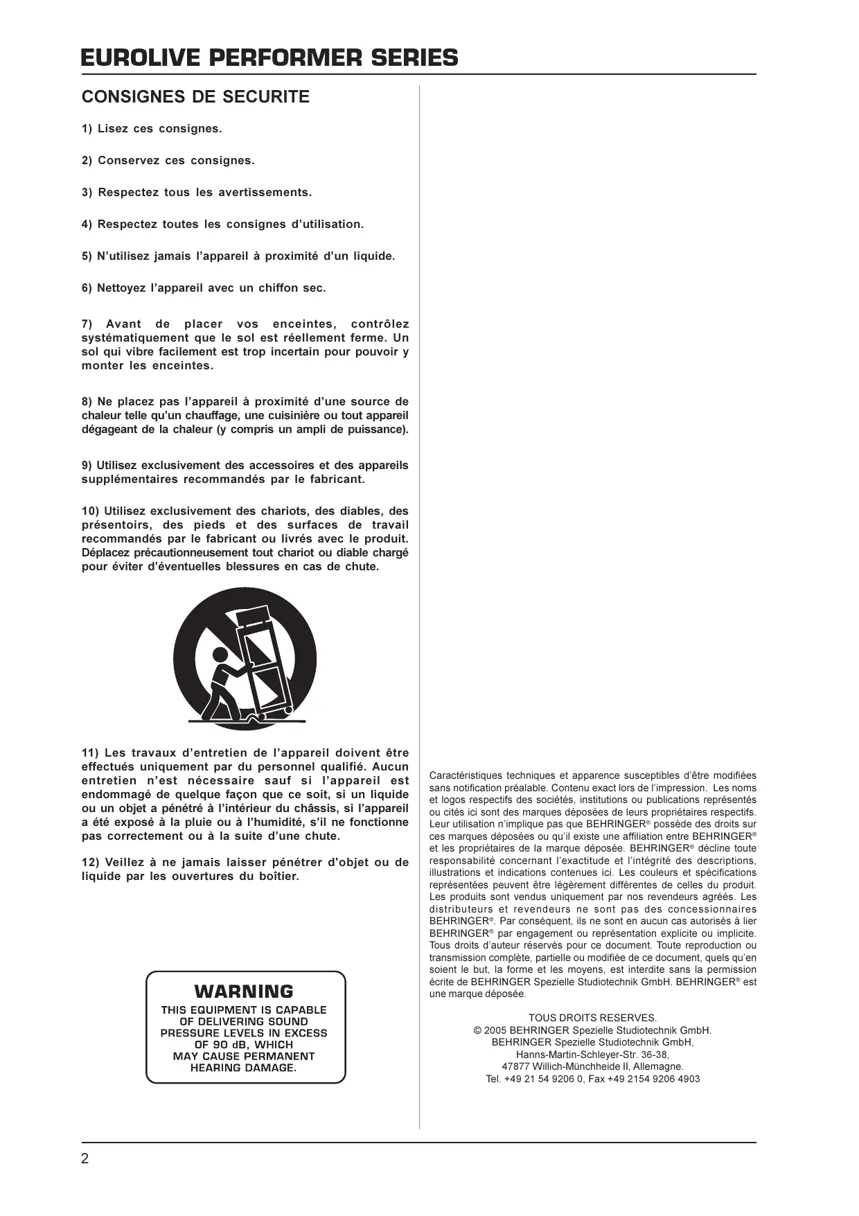 Les enceintes de la série EUROLIVE PERFORMER peuvent développer un volume sonore extrême. Noubliez pas que de fortes pressions acoustiques fatiguent louïe et peuvent même lendommager de façon irrémédiable. Travaillez toujours à des puissances raisonnables.