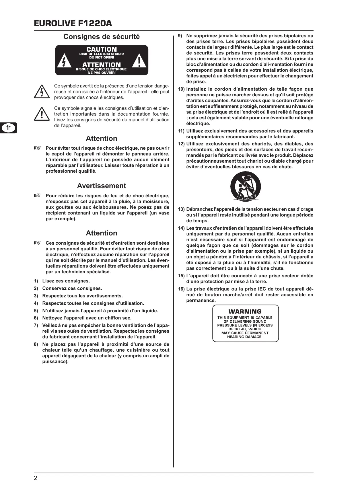 Votre enceinte peut produit des niveaux de pression acoustique extrêmes. N'oubliez pas que des volumes sonores elevés fatiguent votre système auditif et peuvent l'endommager irrémédiablement. Travailliez toujours à des puissances raisonnables.