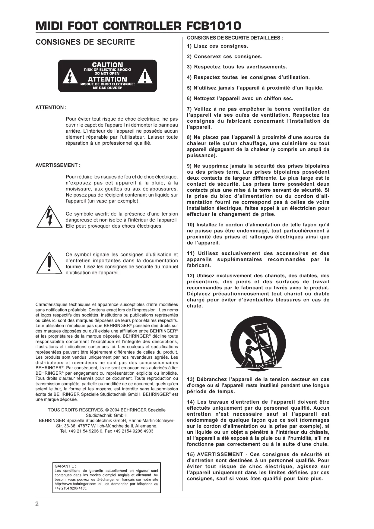Pour réduire les risques de feu et de choc électrique, nexposez pas cet appareil à la pluie, à la moisissure, aux gouttes ou aux éclaboussures. Ne posez pas de récipient contenant un liquide sur lappareil (un vase par exemple). Ce symbole avertit de la présence dune tension dangereuse et non isolée à lintérieur de lappareil. Elle peut provoquer des chocs électriques. Ce symbol signale les consignes dutilisation et dentretien importantes dans la documentation fournie. Lisez les consignes de sécurité du manuel dutilisation de lappareil. Caractéristiques techniques et apparence susceptibles dêtre modifiées sans notification préalable. Contenu exact lors de limpression. Les noms et logos respectifs des sociétés, institutions ou publications représentés ou cités ici sont des marques déposées de leurs propriétaires respectifs. Leur utilisation nimplique pas que BEHRINGER® possède des droits sur ces marques déposées ou quil existe une affiliation entre BEHRINGER® et les propriétaires de la marque déposée. BEHRINGER® décline toute responsabilité concernant lexactitude et lintégrité des descriptions, illustrations et indications contenues ici. Les couleurs et spécifications représentées peuvent être légèrement différentes de celles du produit. Les produits sont vendus uniquement par nos revendeurs agréés. Les distributeurs et revendeurs ne sont pas des concessionnaires BEHRINGER®. Par conséquent, ils ne sont en aucun cas autorisés à lier BEHRINGER® par engagement ou représentation explicite ou implicite. Tous droits dauteur réservés pour ce document. Toute reproduction ou transmission complète, partielle ou modifiée de ce document, quels quen soient le but, la forme et les moyens, est interdite sans la permission écrite de BEHRINGER Spezielle Studiotechnik GmbH. BEHRINGER® est une marque déposée. TOUS DROITS RESERVES. © 2004 BEHRINGER Spezielle Studiotechnik GmbH. BEHRINGER Spezielle Studiotechnik GmbH, Hanns-Martin-SchleyerStr. 36-38, 47877 Willich-Münchheide II, Allemagne. Tel. +49 21 54 9206 0, Fax +49 2154 9206 4903