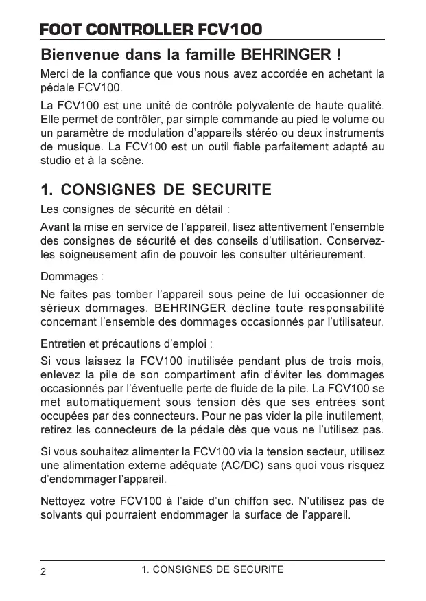 Bienvenue dans la famille BEHRINGER ! Merci de la confiance que vous nous avez accordée en achetant la pédale FCV100. La FCV100 est une unité de contrôle polyvalente de haute qualité. Elle permet de contrôler, par simple commande au pied le volume ou un paramètre de modulation dappareils stéréo ou deux instruments de musique. La FCV100 est un outil fiable parfaitement adapté au studio et à la scène.