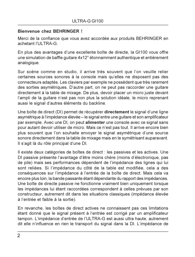 GI100 - Boîtier de direct BEHRINGER - Notice d'utilisation et mode d'emploi gratuit